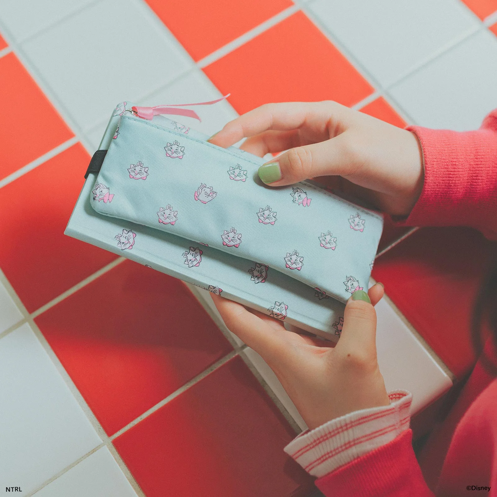 ディズニー・マリーの顔が水色の生地に並ぶ、