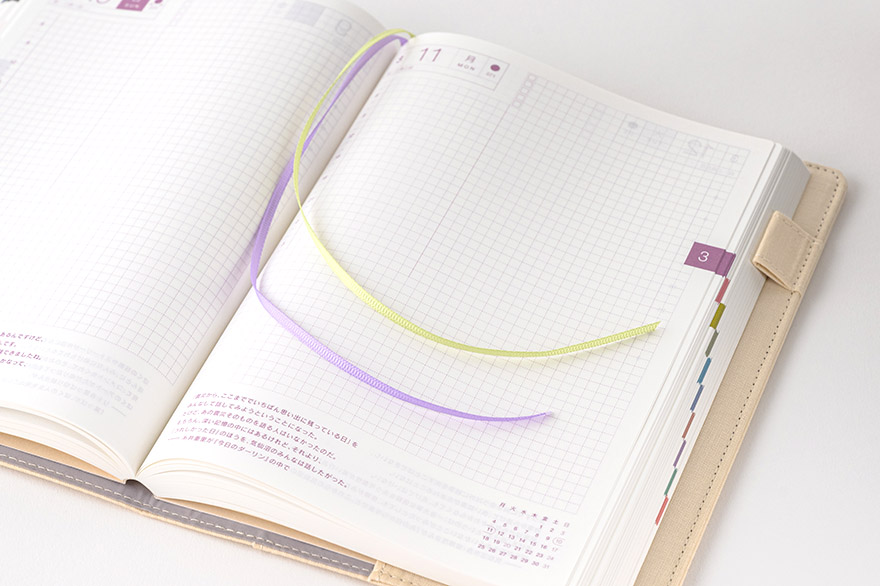 | 紙質・製本 | 薄くて軽く、なめらかな書き心地のトモエリバー(手帳専用紙)/糸かがり製本 |