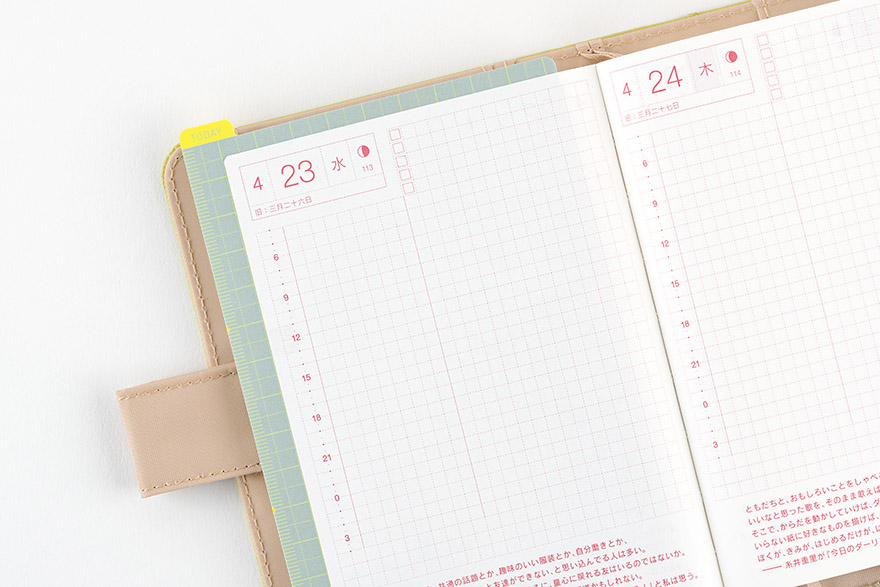 | 記載される内容 | 日番号/週番号(月間カレンダー・週間ダイアリーに記載)/月の満ち欠け(1日ページ全ページに記載、月間カレンダー・週間ダイアリーに満月と新月のみ記載) |