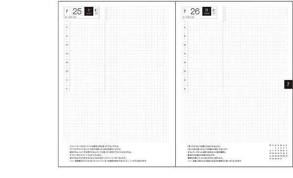 | 記載される内容 | 日番号/週番号(月間カレンダー・週間ダイアリーに記載)/月の満ち欠け(1日ページ全ページに記載、月間カレンダー・週間ダイアリーに満月と新月のみ記載) |