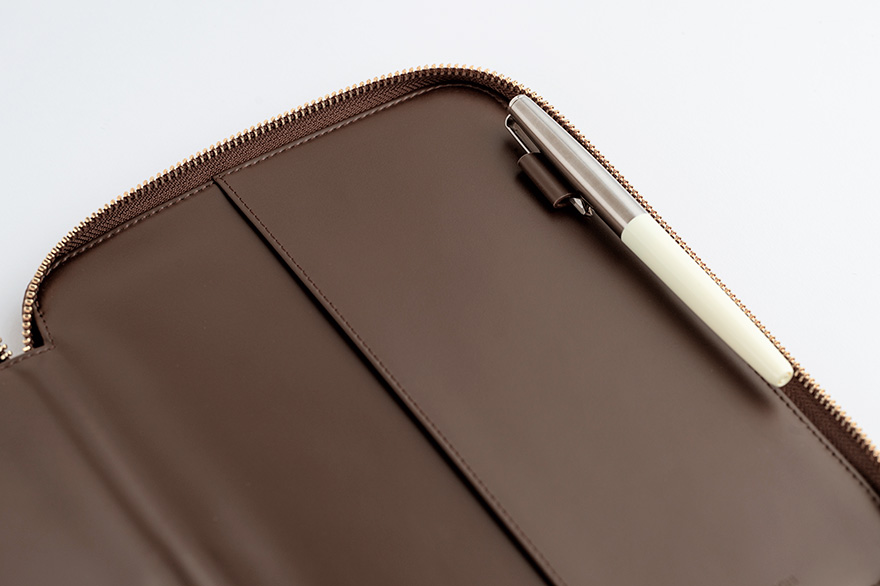 このカバーのペンフックは、ペンのクリップ部分を差し込んで使用するものです。ペンのサイズや形状によっては、ジッパーを開閉しづらくなることがあります。