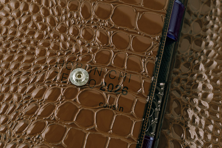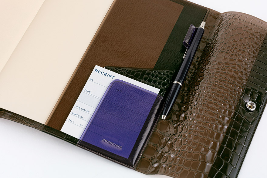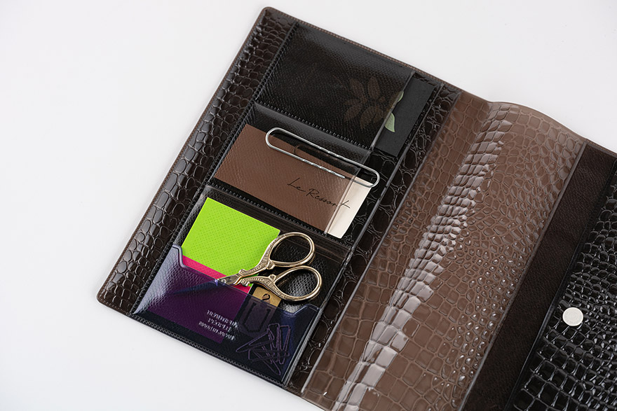 表紙は、PVC素材にクロコダイル柄を型押ししました。