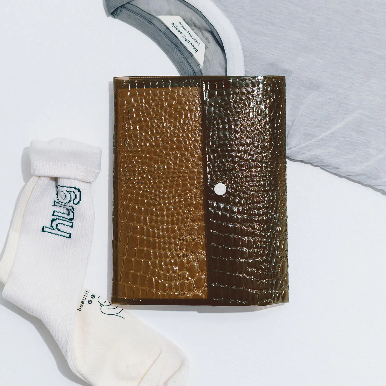 表紙は、PVC素材にクロコダイル柄を型押ししました。