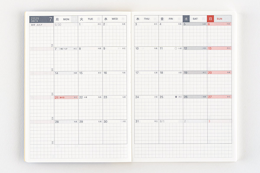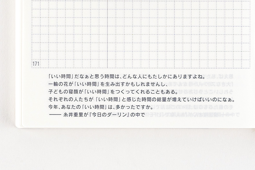 | 紙質・製本 | 薄くて軽く、裏抜けの少ないトモエリバー(手帳専用紙)/糸かがり製本 |