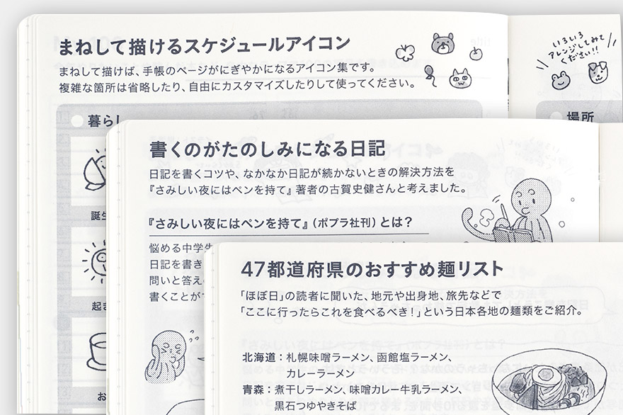 | おまけページ | Time Table/Graph Paper/Favorites/My 100/まねして描けるスケジュールアイコン/書くのがたのしみになる日記/47都道府県のおすすめ麺リスト/二十四節気のこと/もしものときの、準備をしよう/単位換算表/「ほぼ日」を、もっとたのしむ。/Gifts/満年齢早見表/Addresses (for 6 people)/Personal Notes |