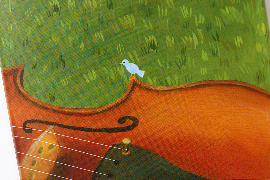 同じく裏表紙には、大きなバイオリンと小さな青い鳥。