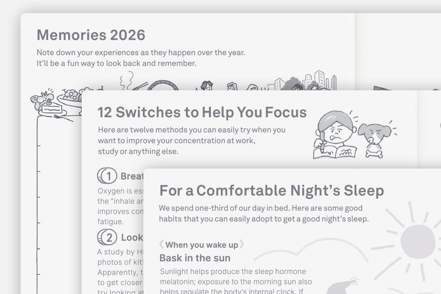 | おまけページ | Time Table / Graph Paper / Favorites / My 100 / Memories 2026 / 12 Switches to Help You Focus / For a Comfortable Night’s Sleep / Words to Remember / 365 Days Check-Off Sheet / Looking Back at the Year 2026 / Getting the Most Out of Your Hobonichi Techo / Gifts / Addresses / Personal Notes |