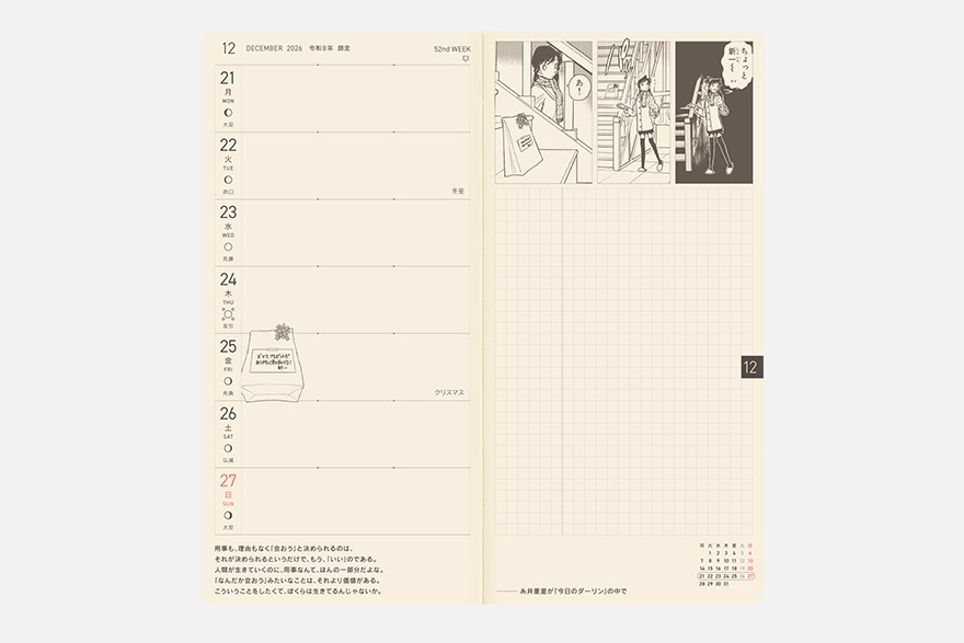 | 記載される内容 | 週番号/六曜(大安、仏滅など)/二十四節気(立春、春分、夏至など)/祝日、記念日など(聖バレンタインデー、ひな祭り、母の日、父の日など)/月の満ち欠け(週間ページ全てに記載・月間カレンダーに満月と新月のみ記載) |