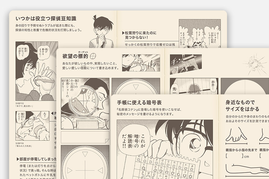 | おまけページ | 365のチェックシート/手帳に使える暗号表/身近なものでサイズをはかる/My 100/あれれ~?/欲望の標的(ターゲット)/四季折々の物語(ミステリー)/明日言いたい「コナン」語録(ワード)/何度も読み返したい名シーン 〈ラヴ編〉/いつかは役に立つ探偵豆知識/二十四節気のこと/もしものときの、準備をしよう/満年齢早見表/単位換算表/「ほぼ日」を、もっとたのしむ。/連絡先リスト/Personal Notes |