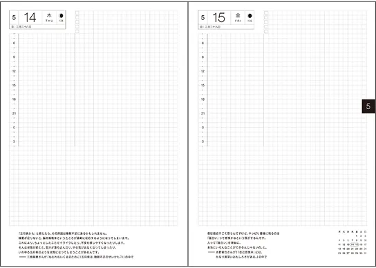 | 記載される内容 | 日番号/週番号(月間カレンダー・週間ダイアリーに記載)/月の満ち欠け(1日ページ全ページに記載、月間カレンダー・週間ダイアリーに満月と新月のみ記載) |