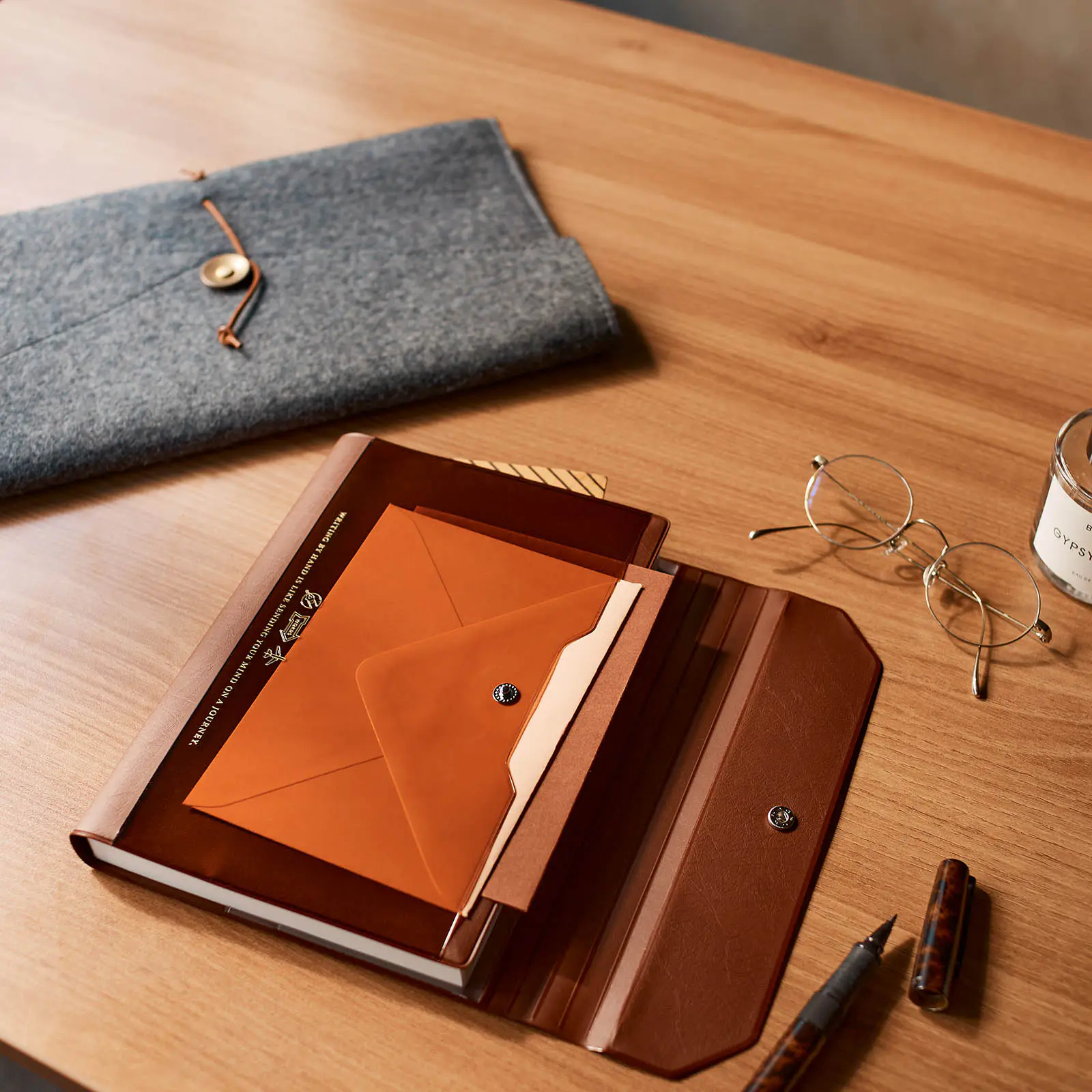 フラップ部分に使用しているブラウンの生地には