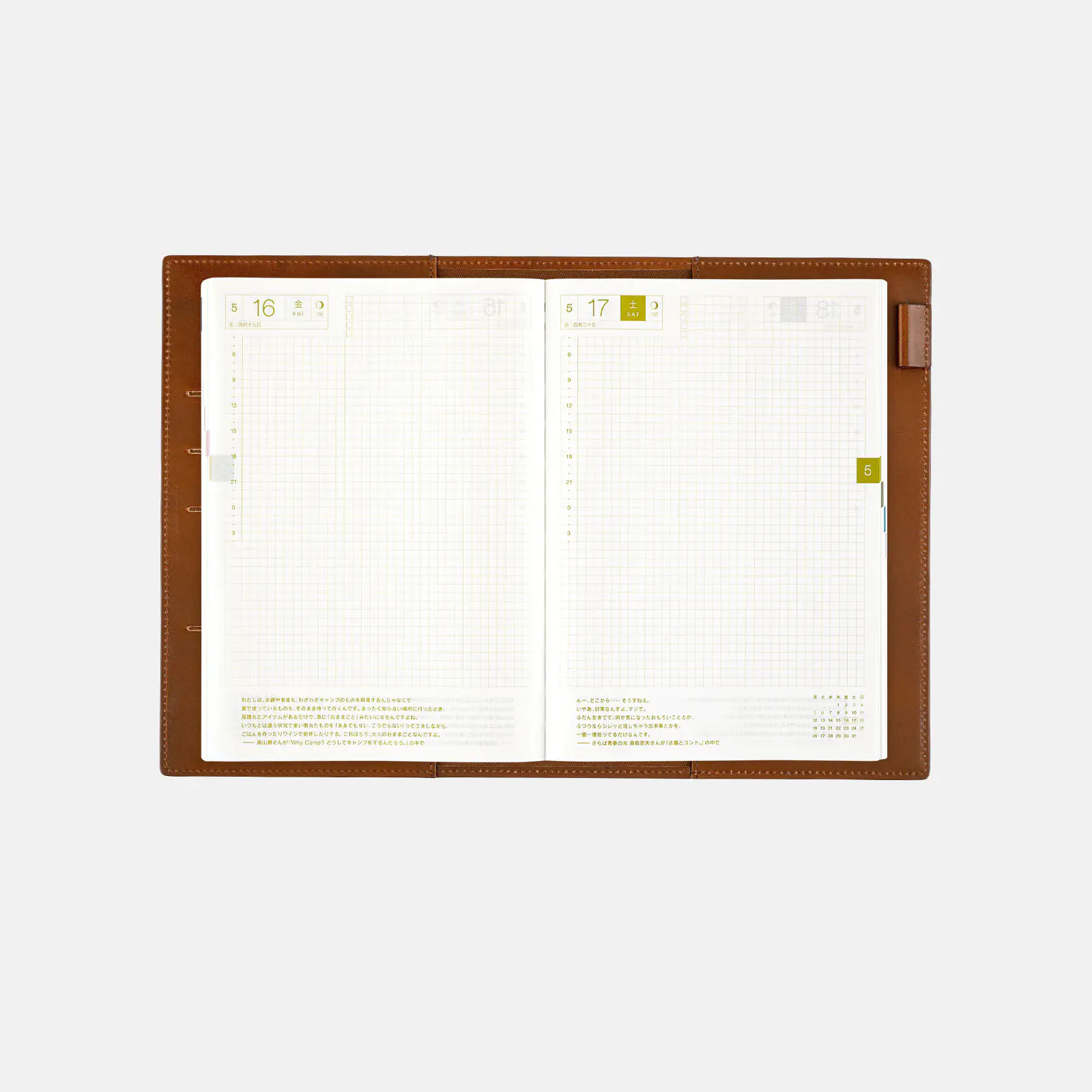 記載される内容日番号/週番号(月間カレンダー・週間ダイアリーに記載)/月の満ち欠け(1日ページ全ページに記載、月間カレンダー・週間ダイアリーに満月と新月のみ記載)