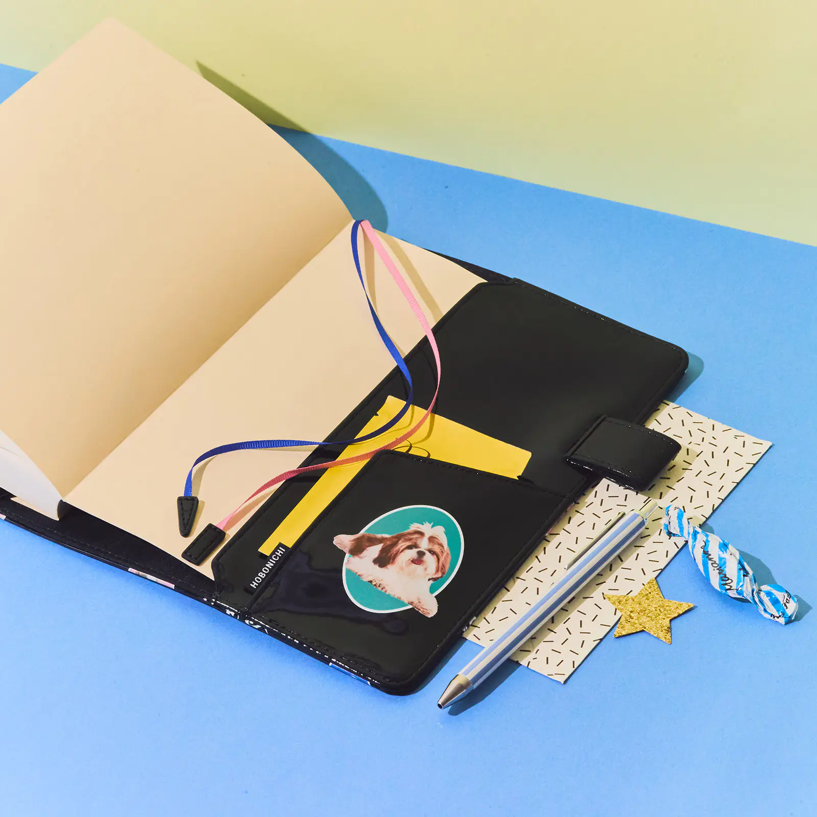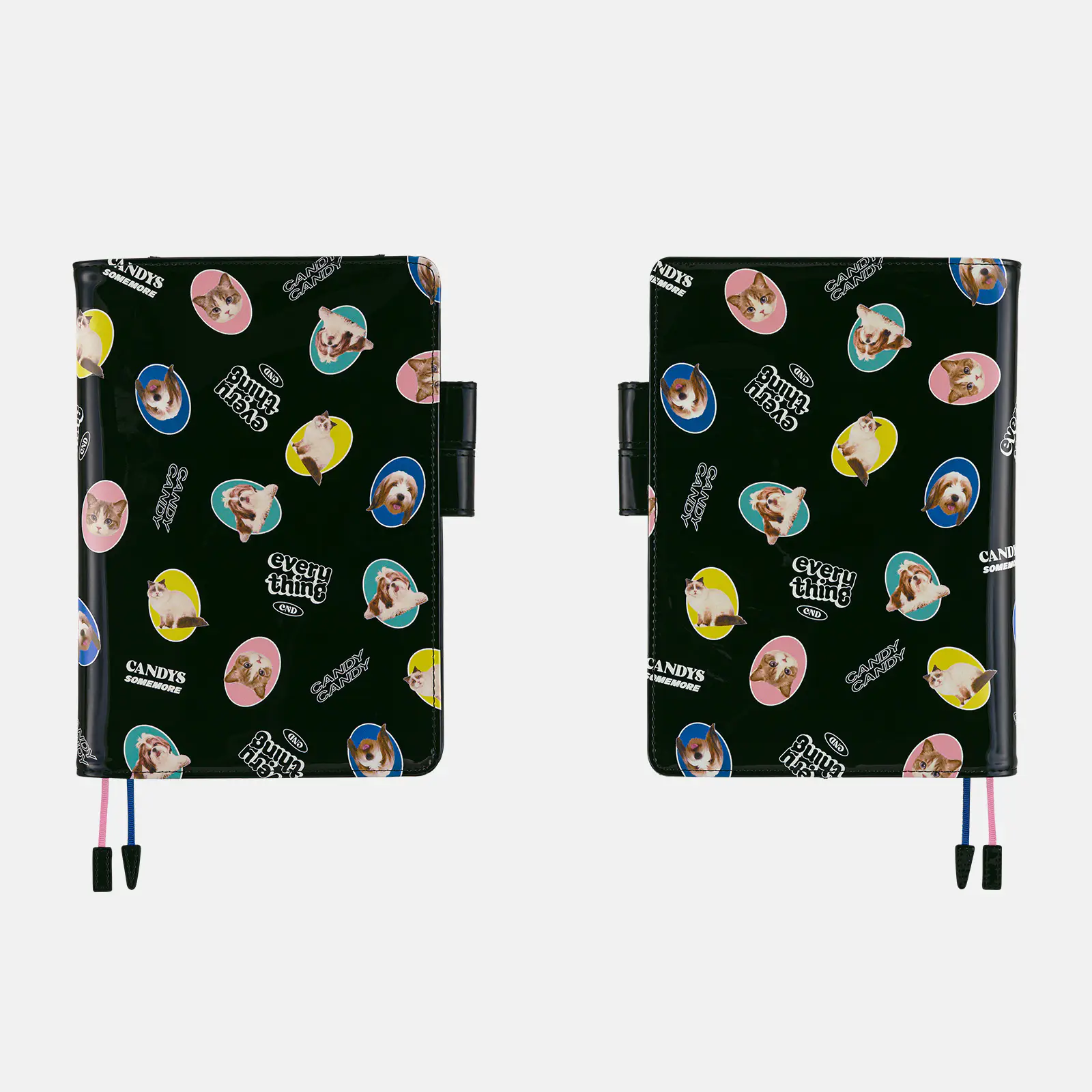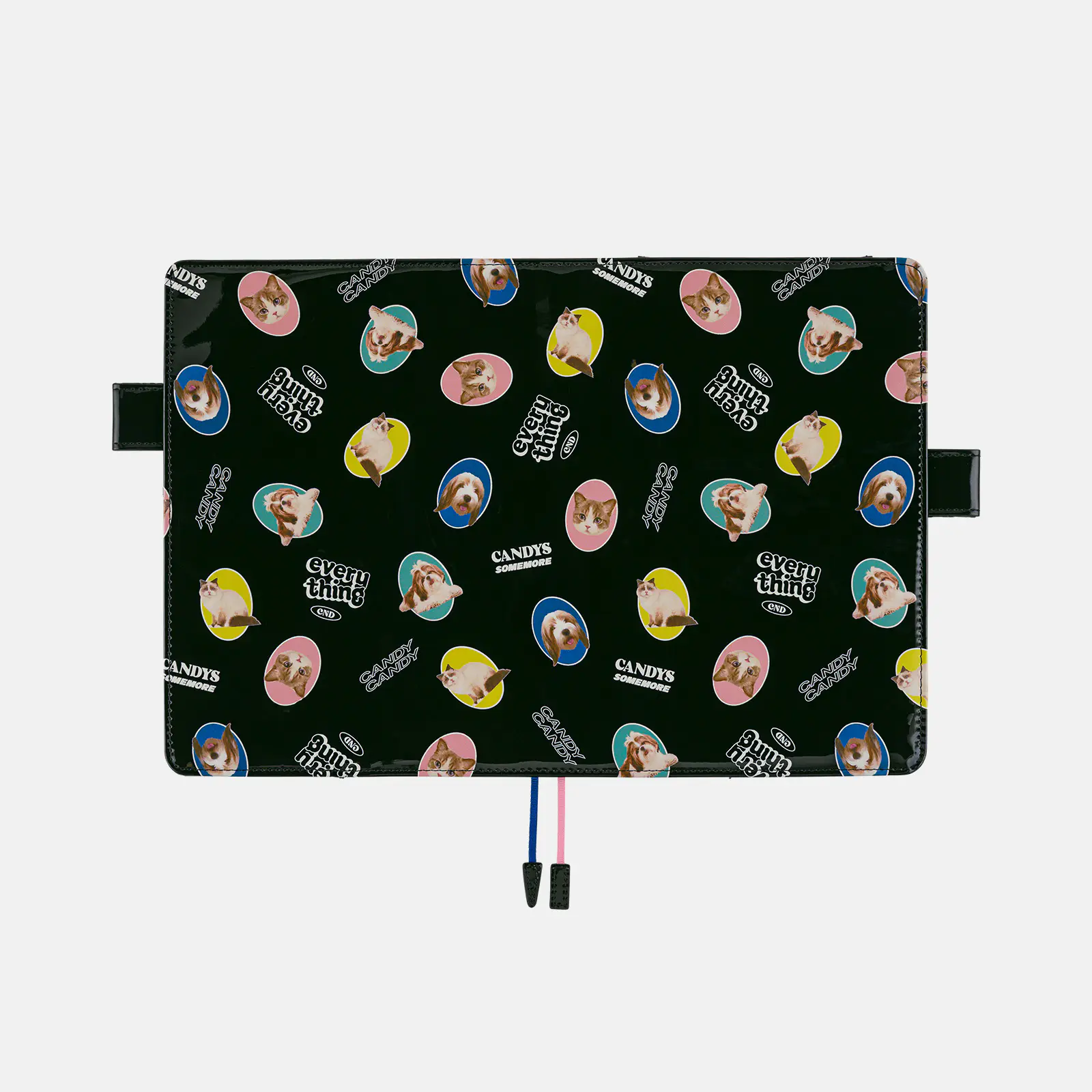 光沢のあるエナメル素材に犬と猫の写真をちりばめた、
