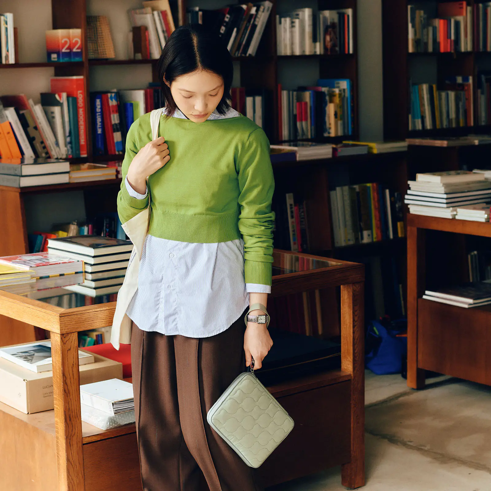 淡いセージグリーンは落ち着いた印象ですが、