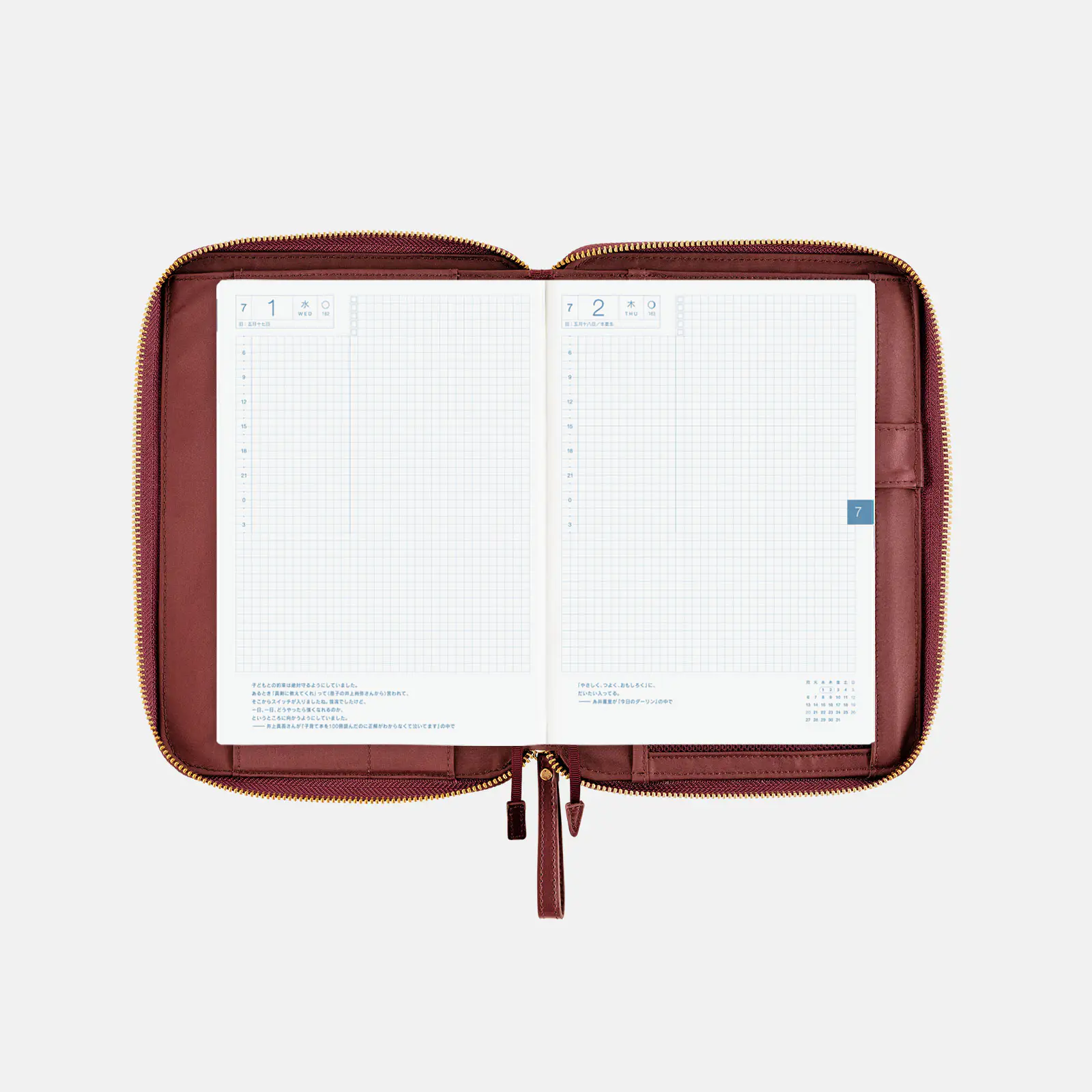 | 記載される内容 | 日番号/週番号(月間カレンダー・週間ダイアリーに記載)/月の満ち欠け(1日ページ全ページに記載、月間カレンダー・週間ダイアリーに満月と新月のみ記載) |
