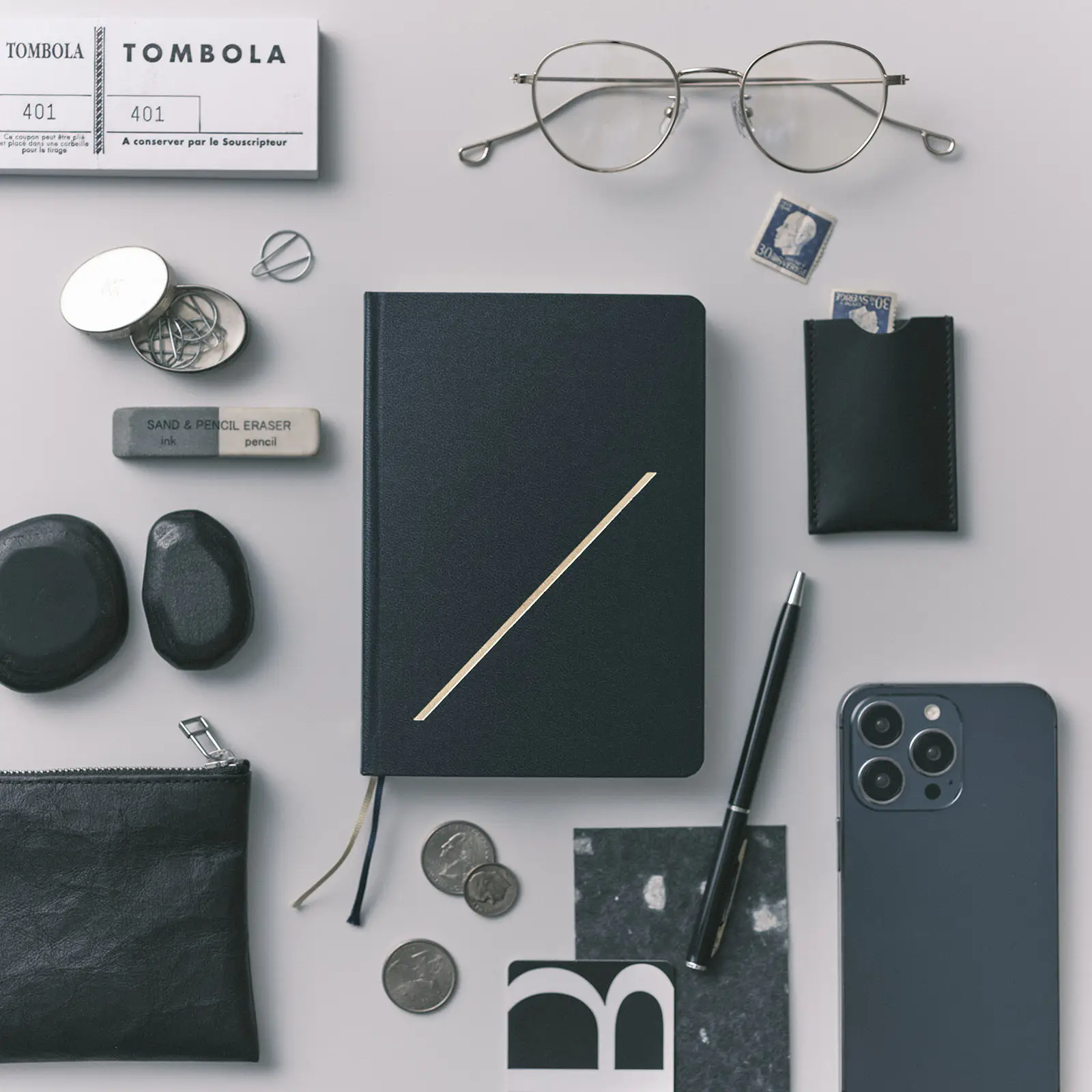 ストーンオブジェ ¥7,700、ジップペンケース ¥7,700、切符入れ ¥5,500(REEL:info@reel-needle.com)