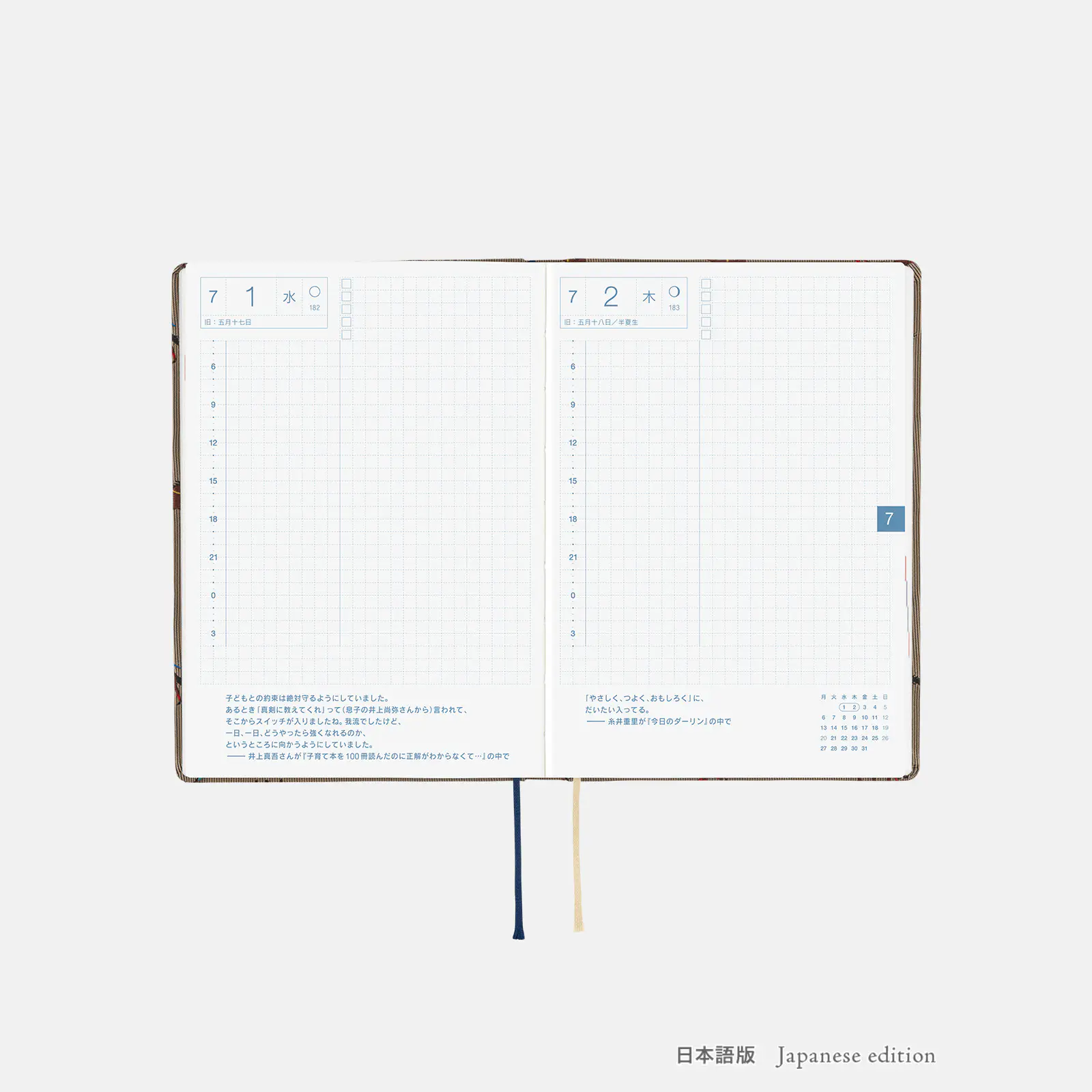 | 1日ページ | 2026年1月1日〜12月31日(全377ページ) *各月のはじめに、その月のことをまとめて書ける扉ページ(1ページ)があります。 *すべてのページに「日々の言葉」を掲載(見開きに1つ)。 *右ページに「ミニカレンダー」を掲載(月曜はじまり)。 *このほか、1日ページのはじめに、自由に使える「Turning the page to a new year」(2ページ)があります。 |