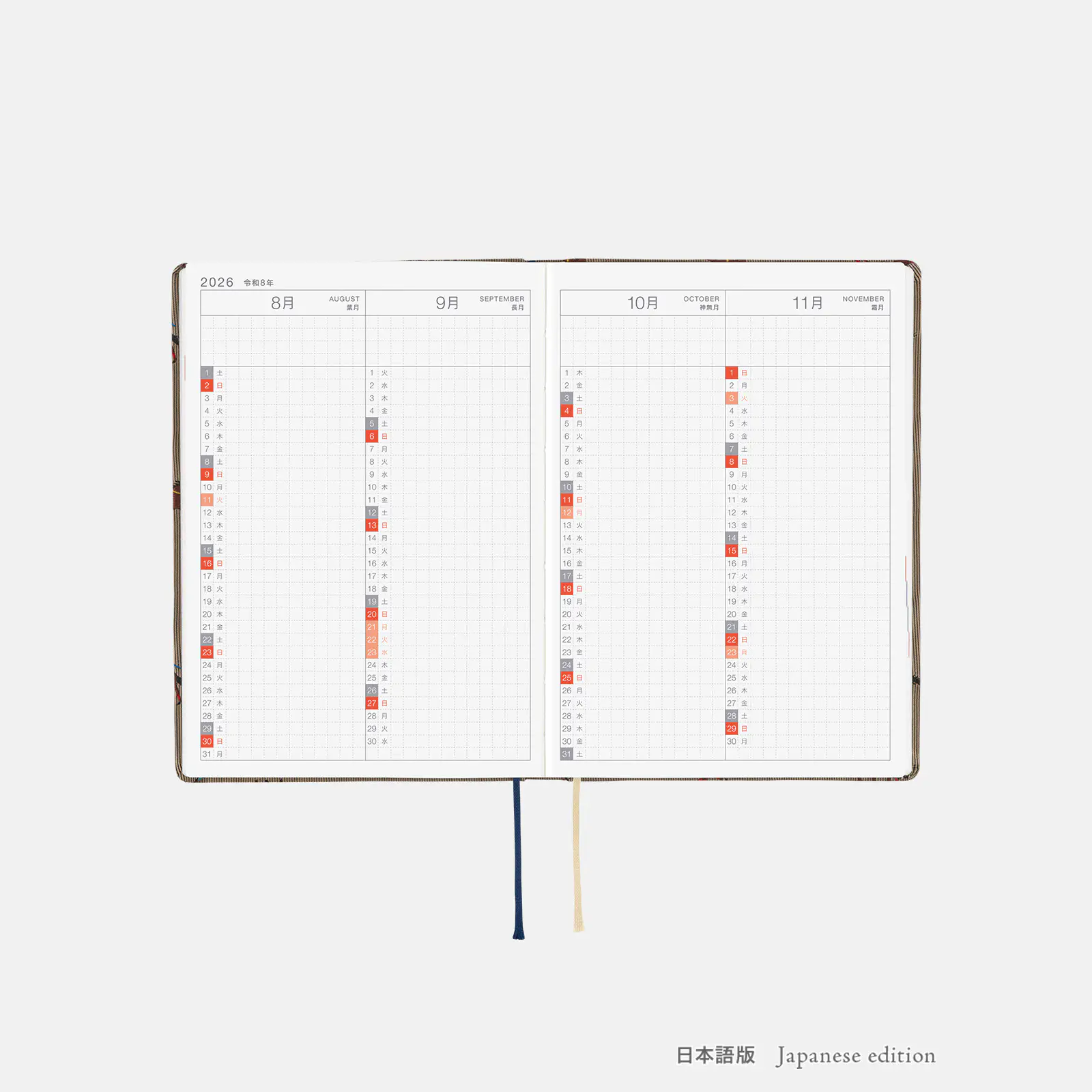 | 1日ページ | 2026年1月1日〜12月31日(全377ページ ) *各月のはじめに、「ことしの歳時記」と、その月のことをまとめて書ける扉ページ(1ページ)があります。 *すべてのページに「日々の言葉」を掲載。 *右ページに「ミニカレンダー」を掲載(月曜もしくは日曜はじまり)。 *このほか、1日ページのはじめに、自由に使える「Turning the page to a new year」(2ページ)があります。 |