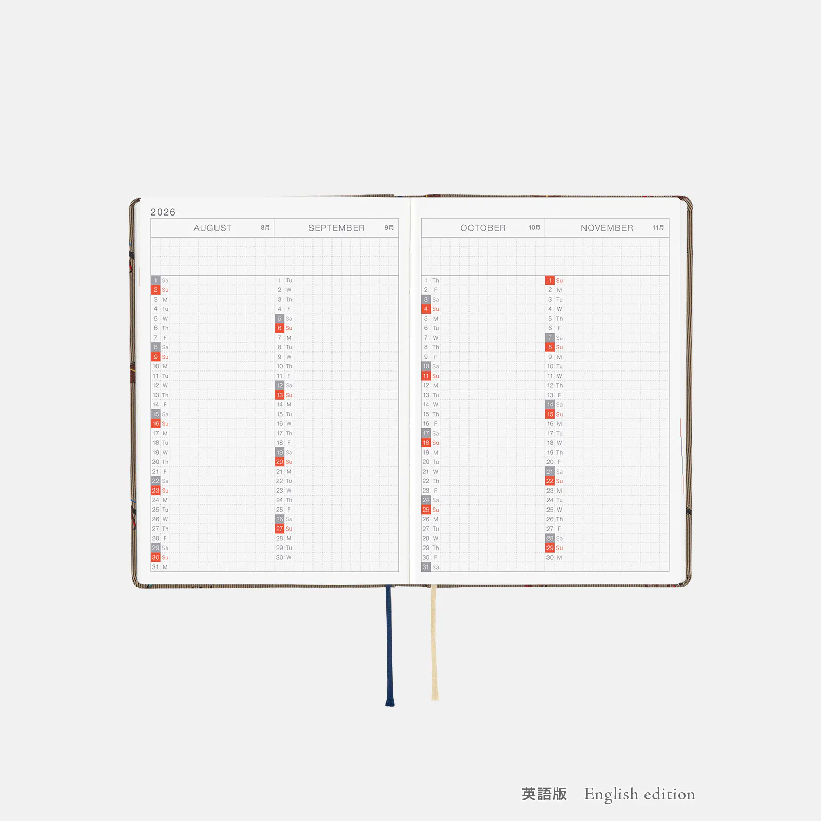 | おまけページ | Time Table / Graph Paper / Favorites / My 100 / Memories 2026 / 12 Switches to Help You Focus / For a Comfortable Night’s Sleep / Words to Remember / 365 Days Check-Off Sheet / Looking Back at the Year 2026 / Getting the Most Out of Your Hobonichi Techo / Gifts / Addresses / Personal Notes |
