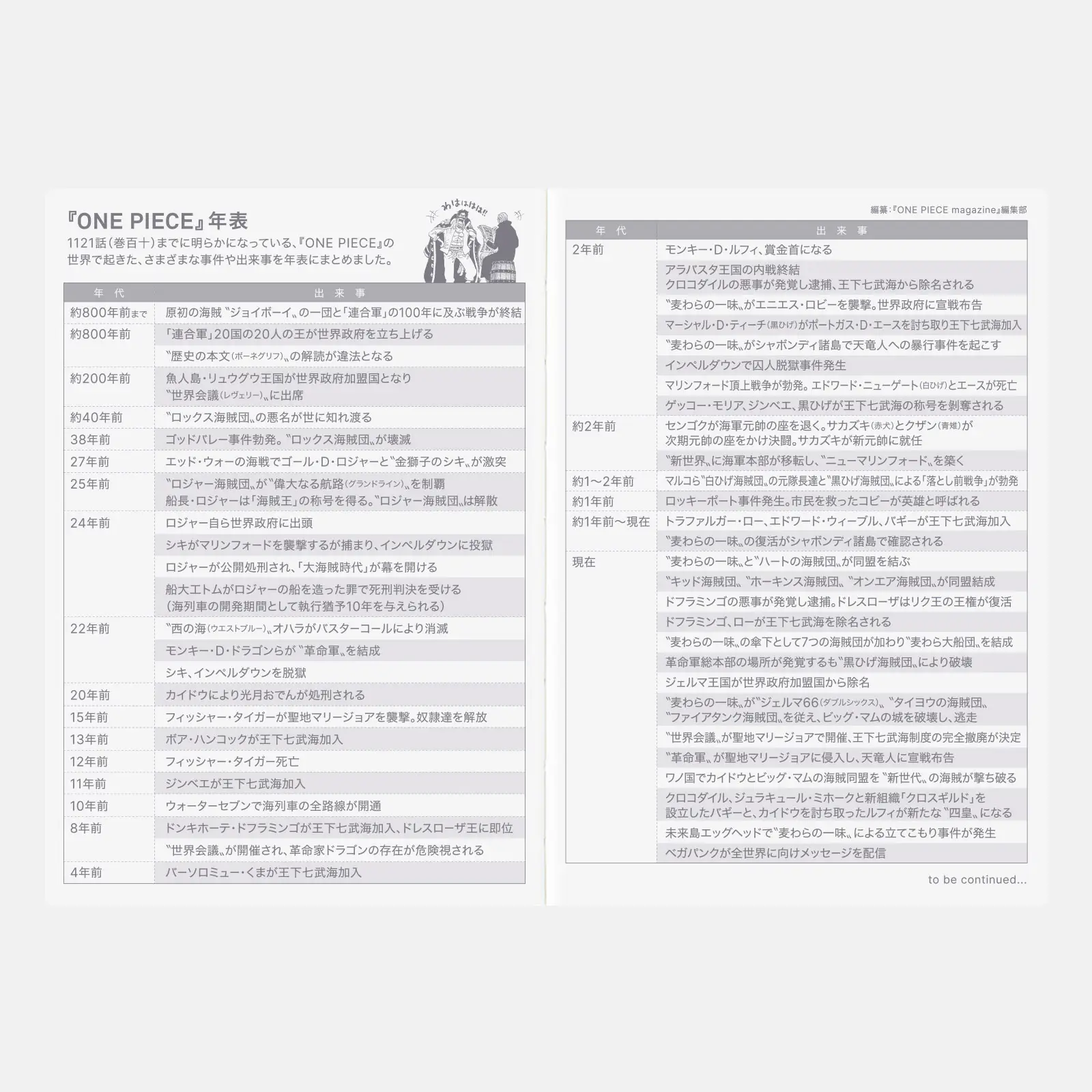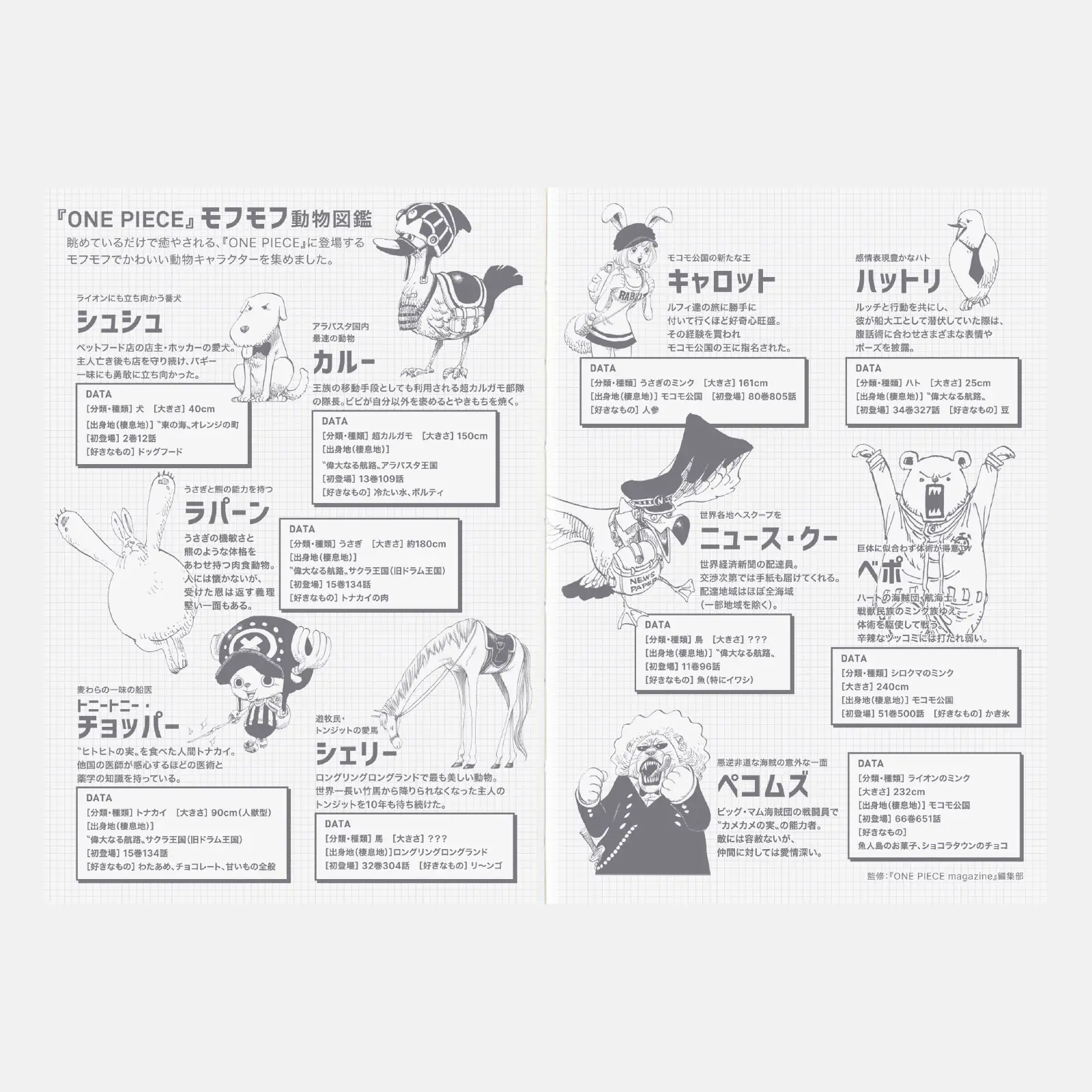 おまけページ『ONE PIECE』年表/明日誰かに話したくなる『ONE PIECE』雑学/『ONE PIECE』モフモフ動物図鑑/WANTED/Time Table/Favorites/My 100/二十四節気のこと/もしものときの、準備をしよう/Gifts/満年齢早見表/Addresses/Personal Notes