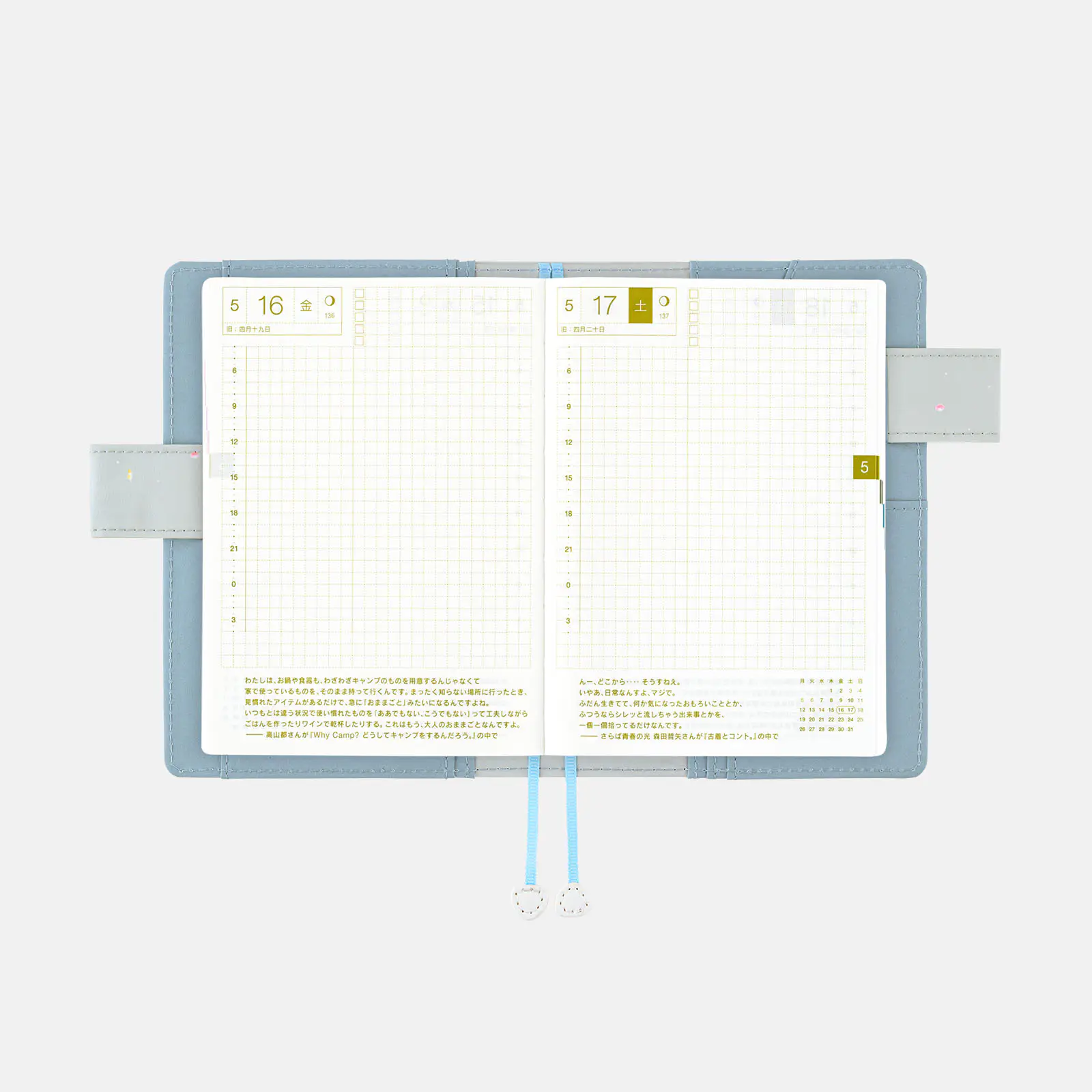 記載される内容日番号/週番号(月間カレンダーに記載)/月の満ち欠け(1日ページ全ページに記載、月間カレンダーに満月と新月のみ記載)
