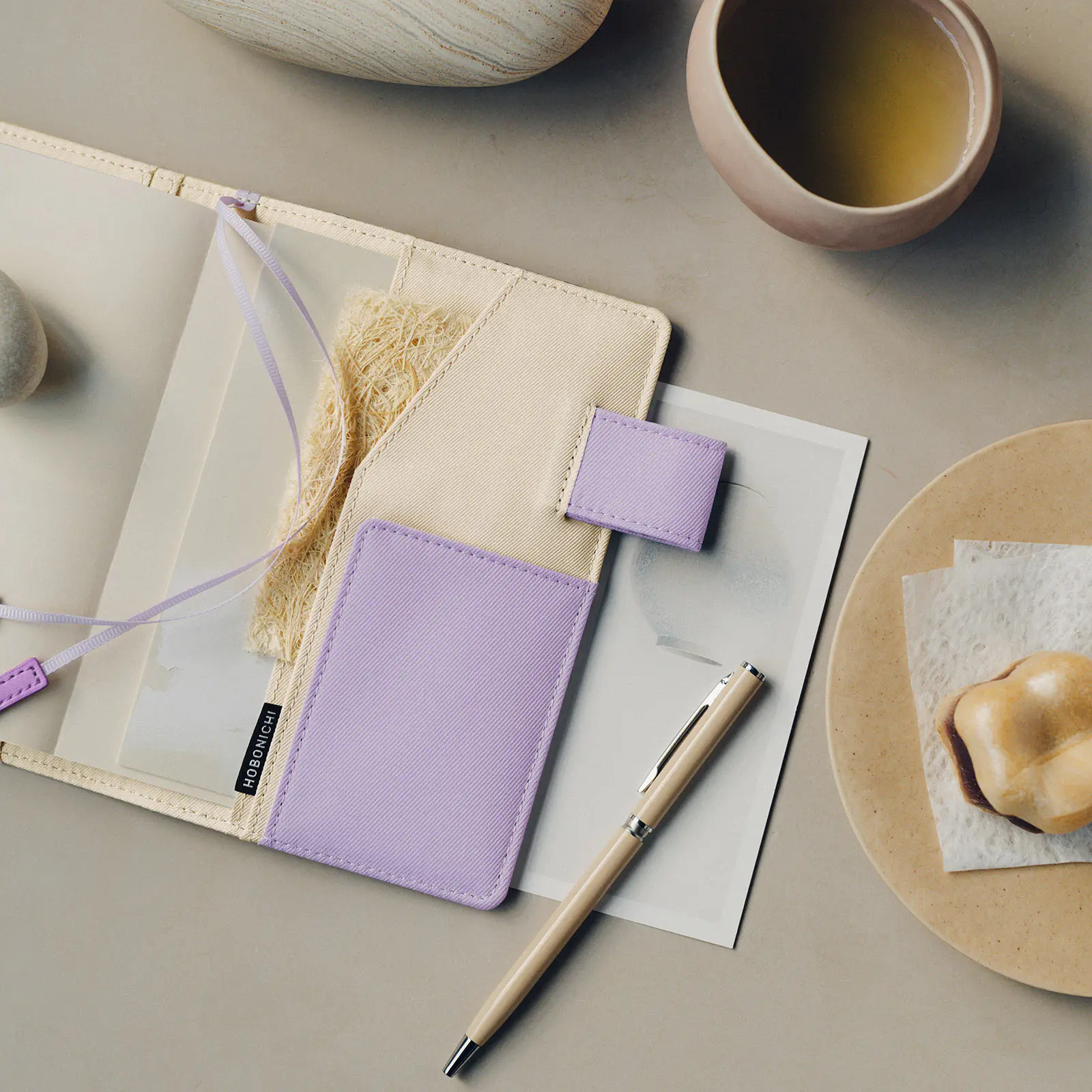 バタフライストッパー、内側のポケット、しおりは薄紫色。
