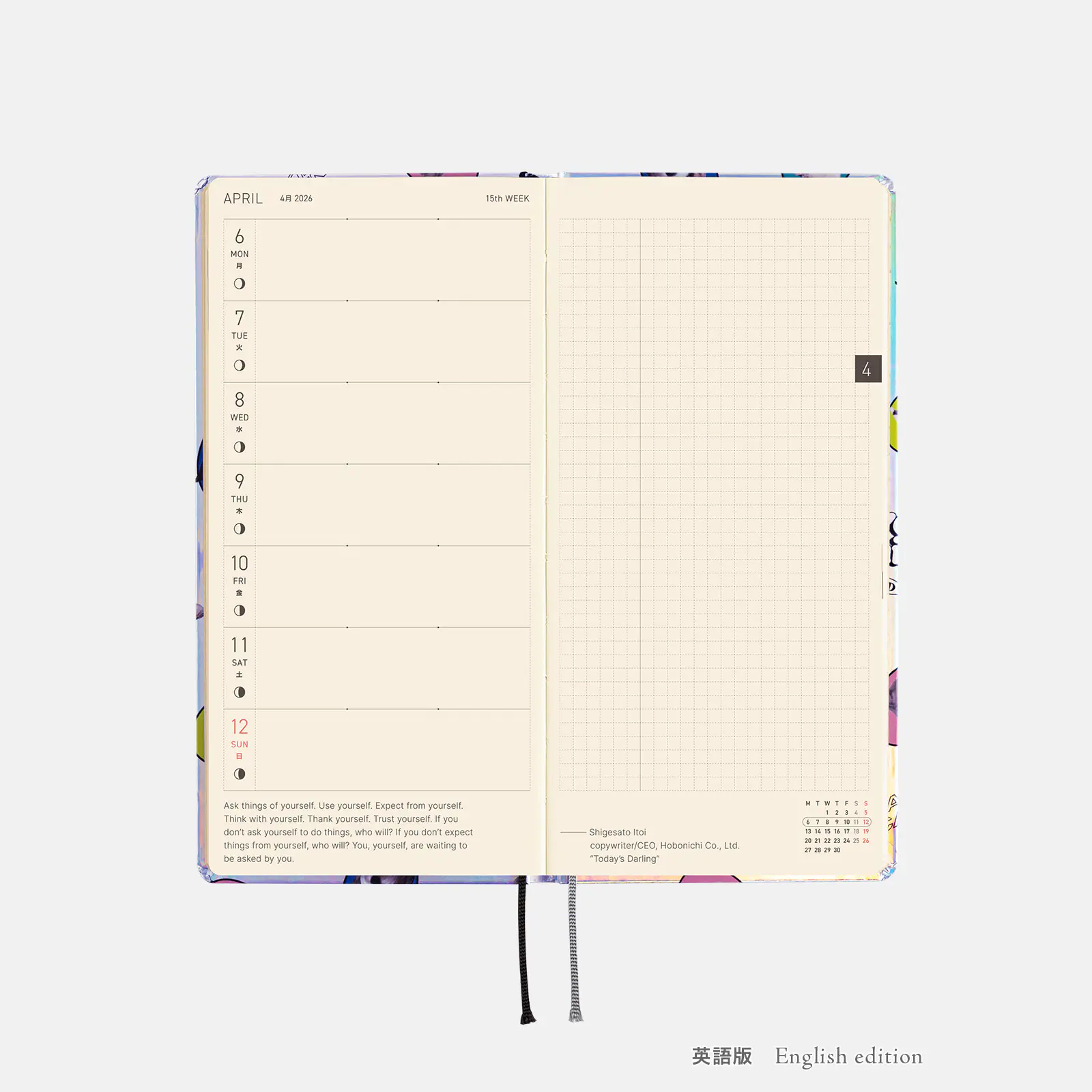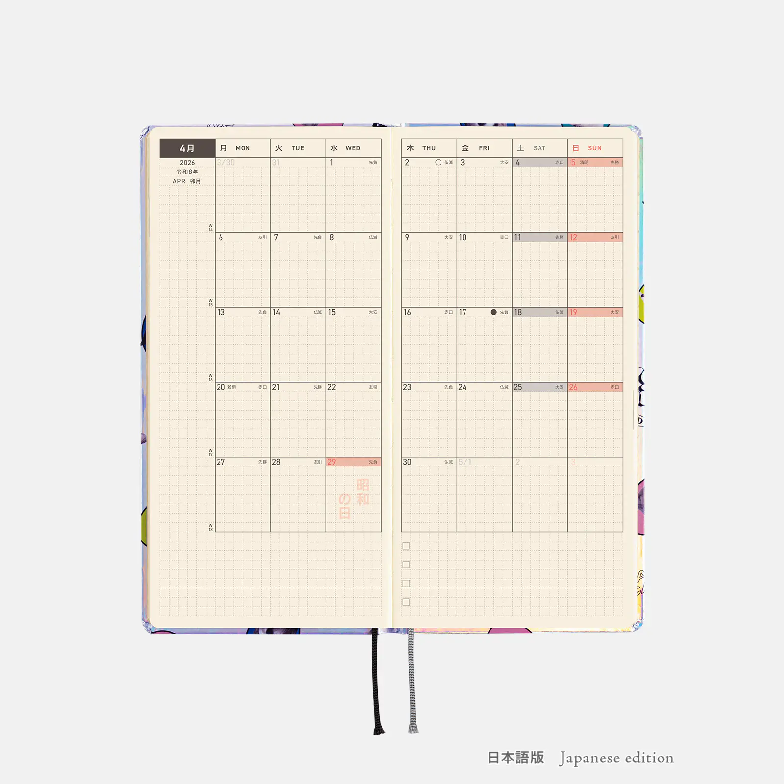 | 記載される内容 | 週番号/六曜(大安、仏滅など)/二十四節気(立春、春分、夏至など)/祝日、記念日など(聖バレンタインデー、ひな祭り、母の日、父の日など)/月の満ち欠け(週間ページ全てに記載・月間カレンダーに満月と新月のみ記載) |