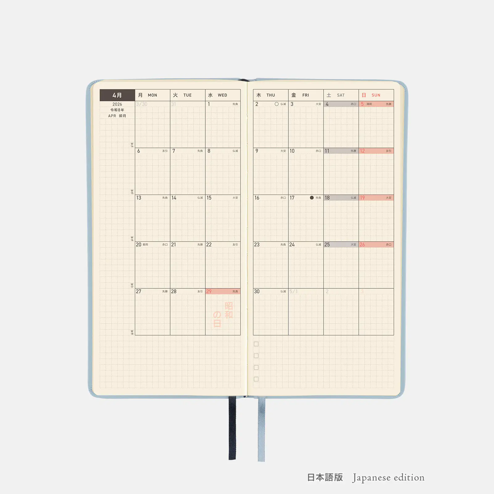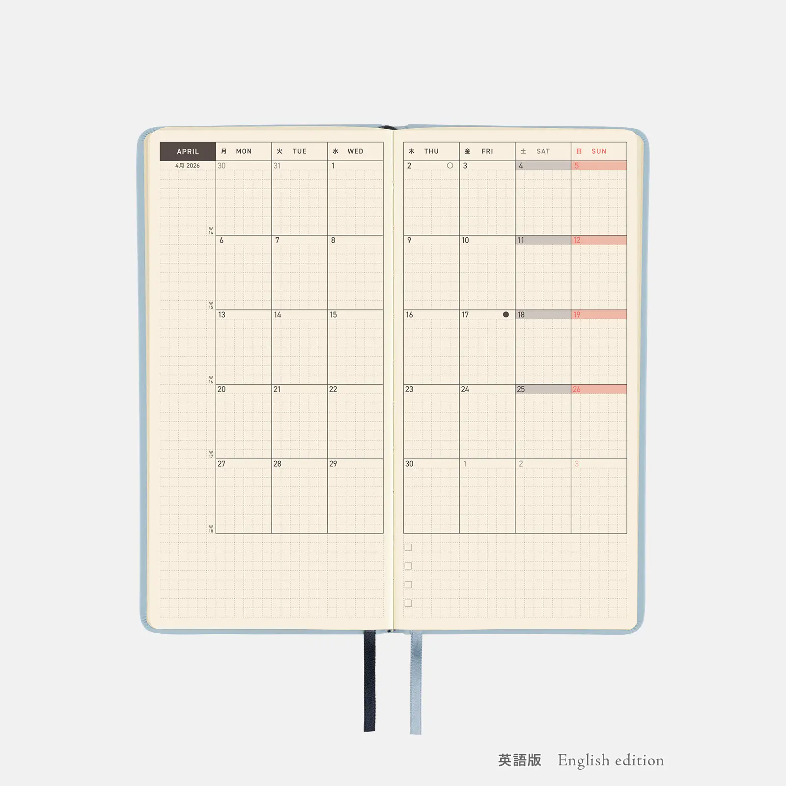 | 紙質・製本 | 薄くて軽く、なめらかな書き心地のトモエリバー(手帳専用紙)/糸かがり製本 |