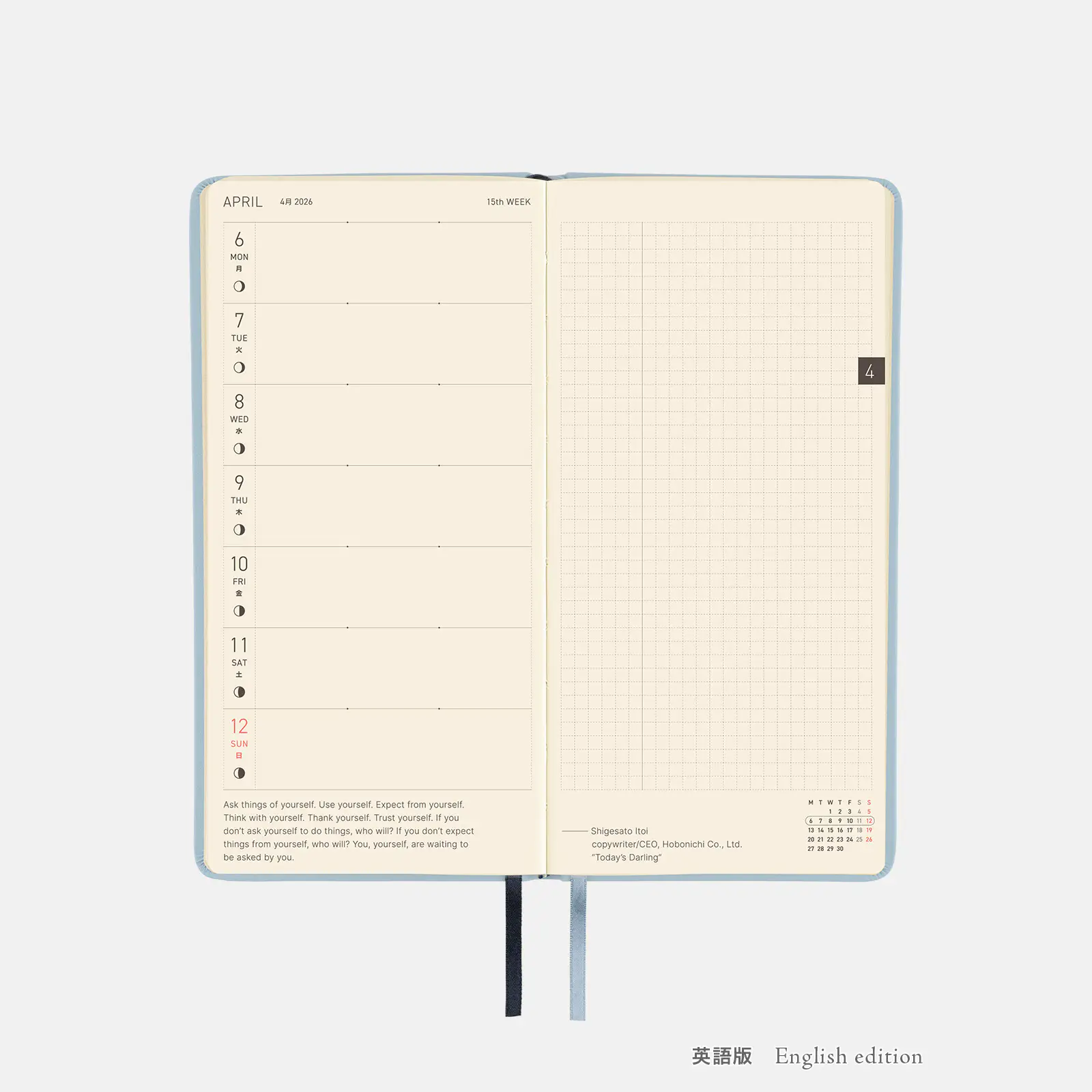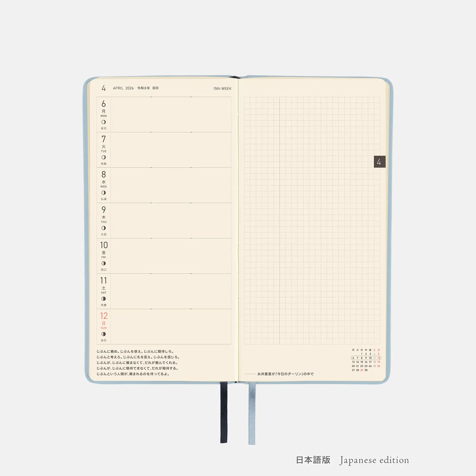 | 記載される内容 | 週番号/六曜(大安、仏滅など)/二十四節気(立春、春分、夏至など)/祝日、記念日など(聖バレンタインデー、ひな祭り、母の日、父の日など)/月の満ち欠け(週間ページ全てに記載・月間カレンダーに満月と新月のみ記載) |