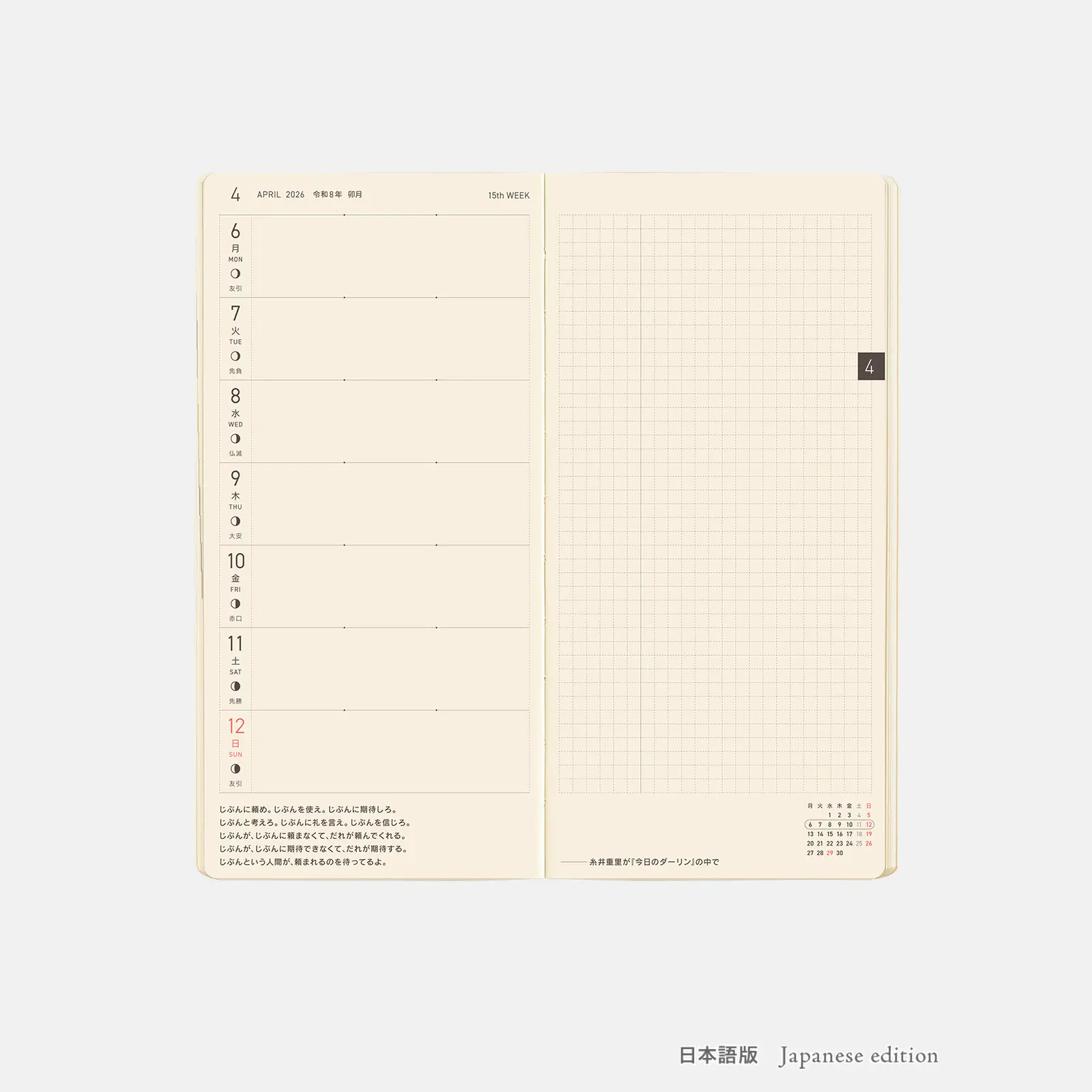 記載される内容週番号/六曜(大安、仏滅など)/二十四節気(立春、春分、夏至など)/祝日、記念日など(聖バレンタインデー、ひな祭り、母の日、父の日など)/月の満ち欠け(週間ページ全てに記載・月間カレンダーに満月と新月のみ記載)