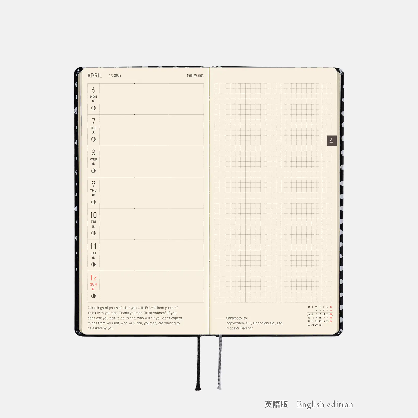 | 記載される内容 | 週番号/月の満ち欠け(週間ページ全てに記載・月間カレンダーに満月と新月のみ記載) ※祝日の記載はありません。 |