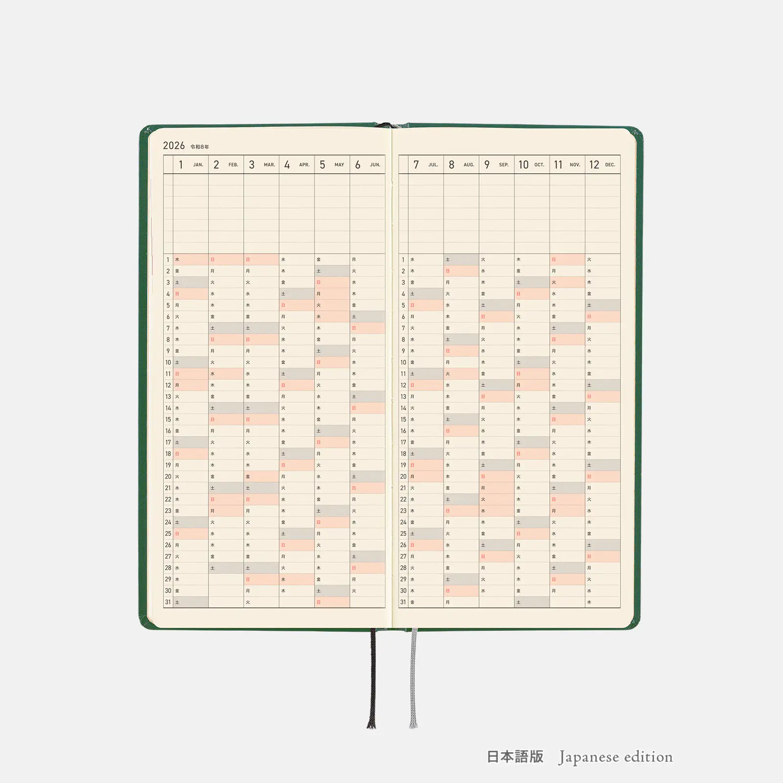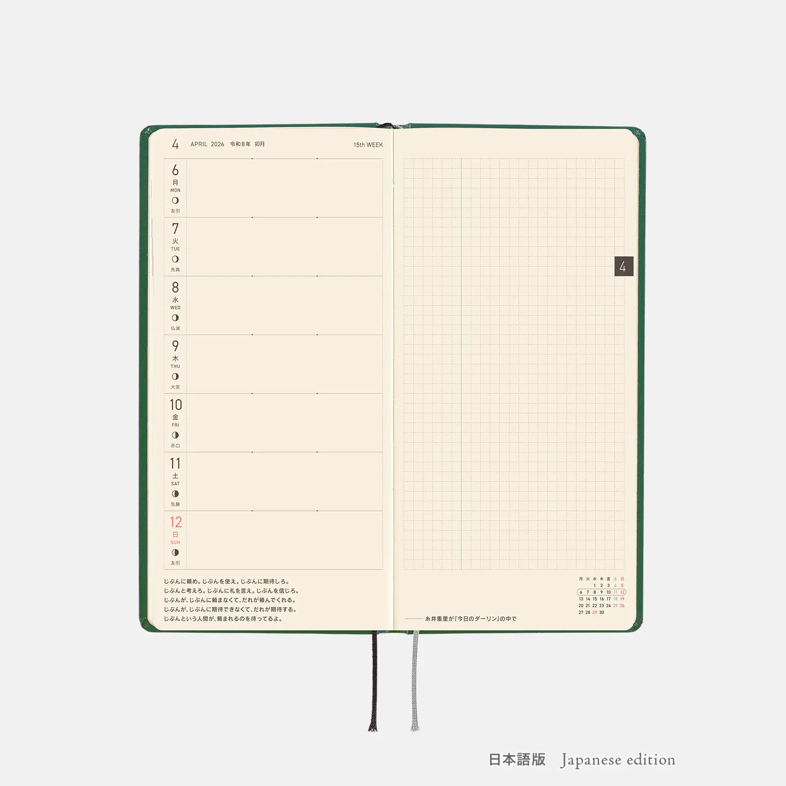 | 記載される内容 | 週番号/六曜(大安、仏滅など)/二十四節気(立春、春分、夏至など)/祝日、記念日など(聖バレンタインデー、ひな祭り、母の日、父の日など)/月の満ち欠け(週間ページ全てに記載・月間カレンダーに満月と新月のみ記載) |