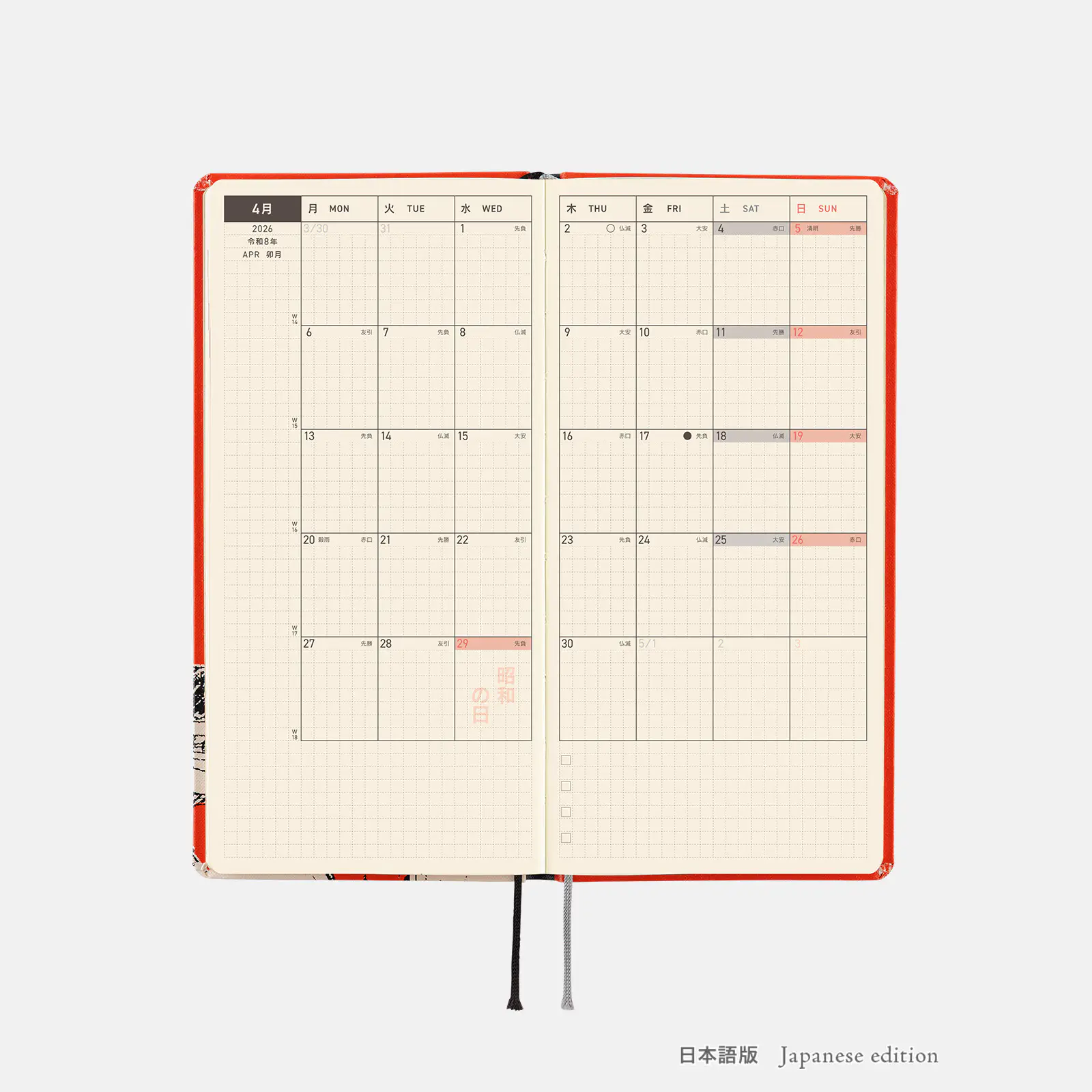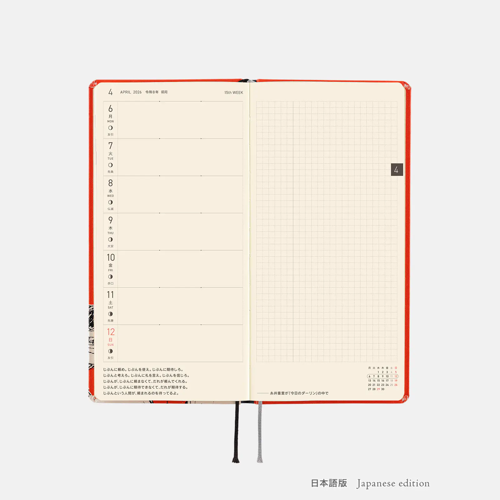 | 記載される内容 | 週番号/六曜(大安、仏滅など)/二十四節気(立春、春分、夏至など)/祝日、記念日など(聖バレンタインデー、ひな祭り、母の日、父の日など)/月の満ち欠け(週間ページ全てに記載・月間カレンダーに満月と新月のみ記載) |