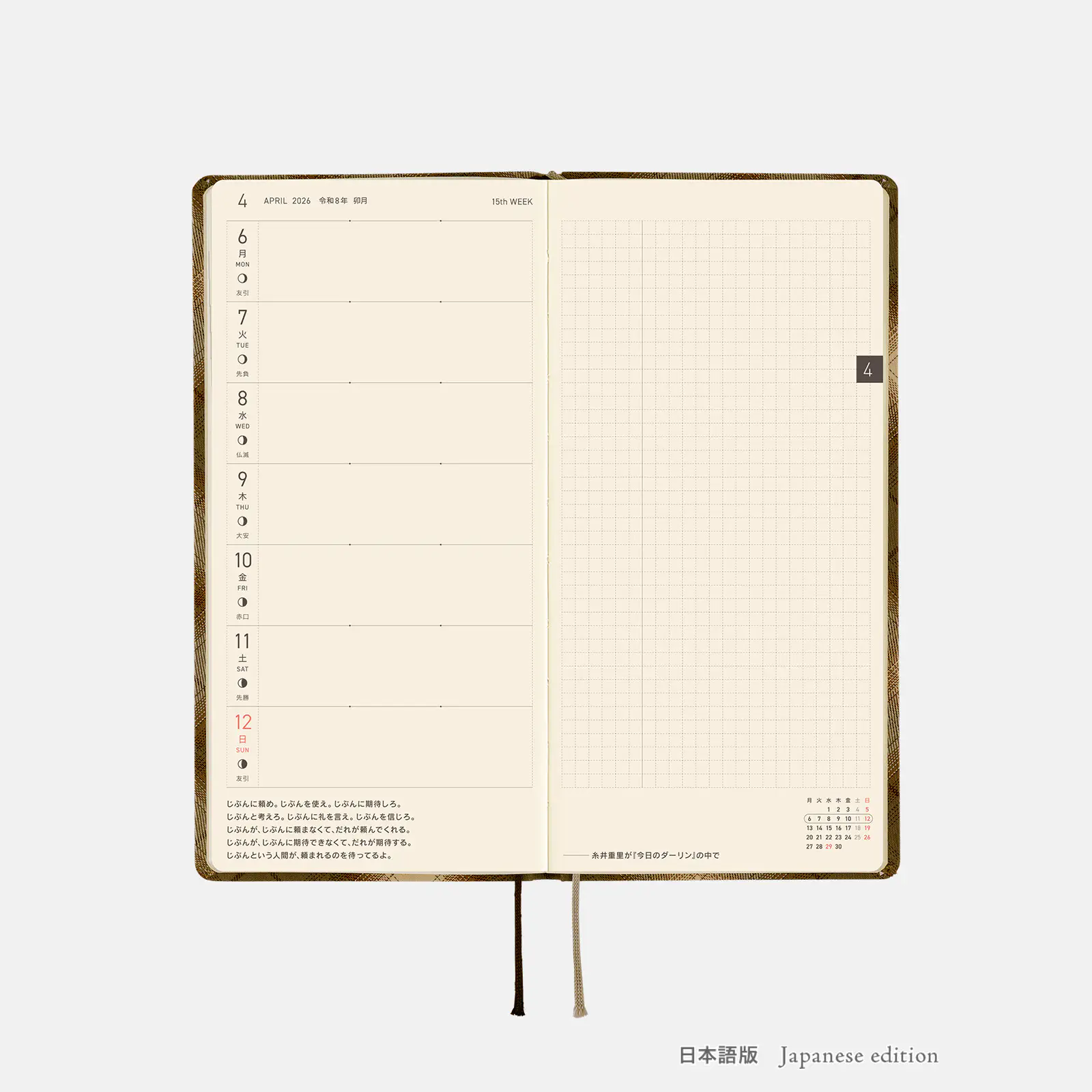 | 記載される内容 | 週番号/六曜(大安、仏滅など)/二十四節気(立春、春分、夏至など)/祝日、記念日など(聖バレンタインデー、ひな祭り、母の日、父の日など)/月の満ち欠け(週間ページ全てに記載・月間カレンダーに満月と新月のみ記載) |