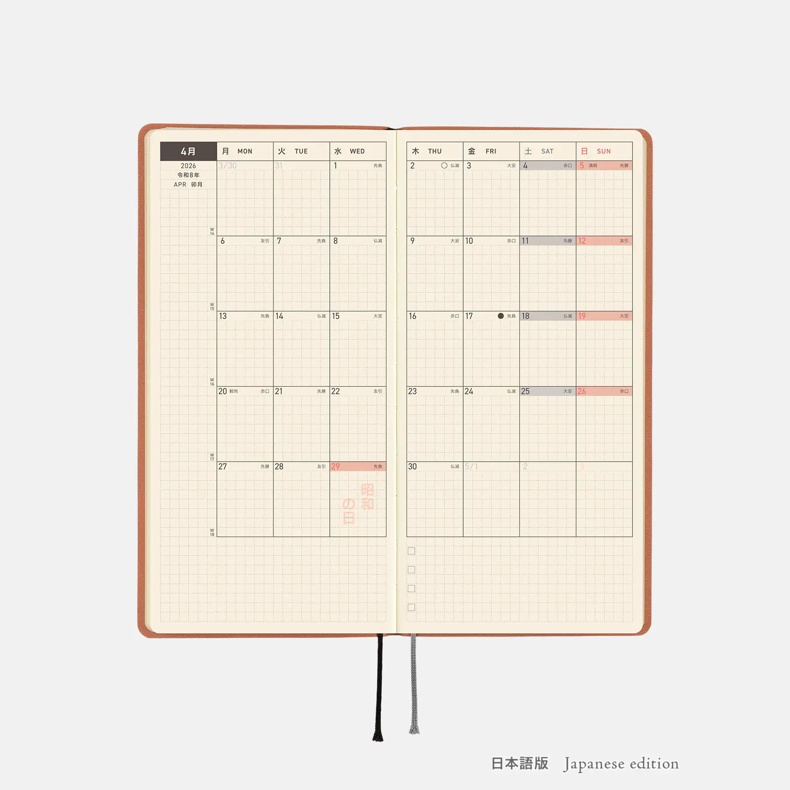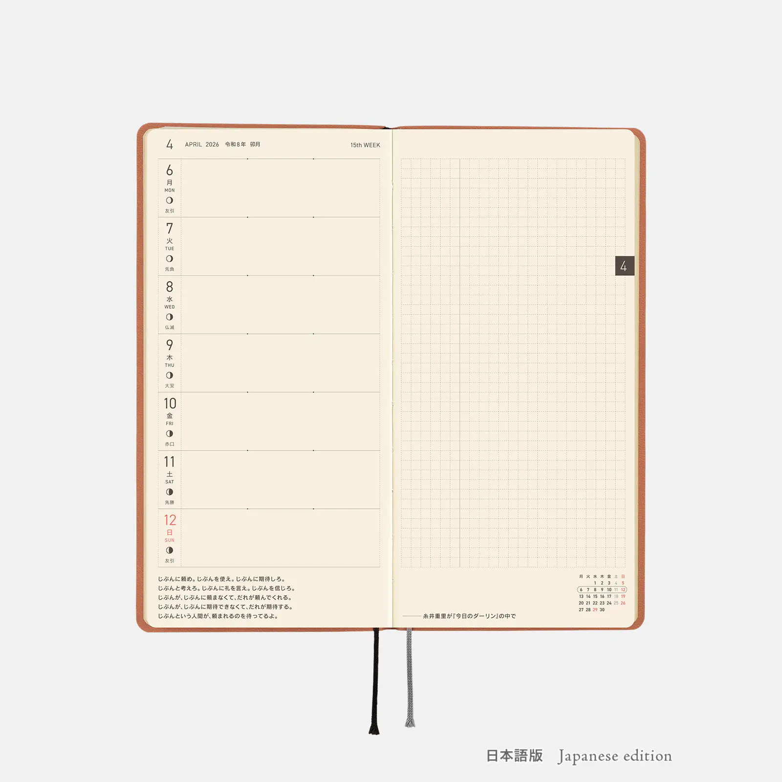 | 記載される内容 | 週番号/六曜(大安、仏滅など)/二十四節気(立春、春分、夏至など)/祝日、記念日など(聖バレンタインデー、ひな祭り、母の日、父の日など)/月の満ち欠け(週間ページ全てに記載・月間カレンダーに満月と新月のみ記載) |