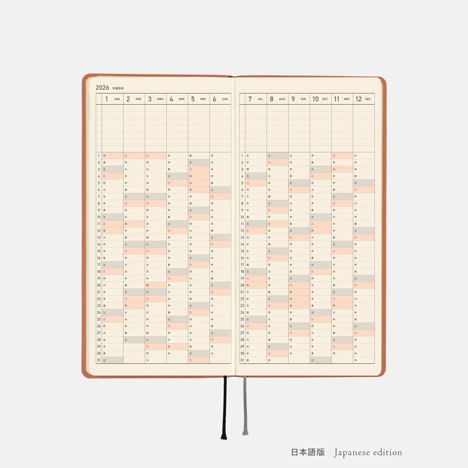 | 紙質・製本 | 薄くて軽く、なめらかな書き心地のトモエリバー(手帳専用紙)/糸かがり製本 |