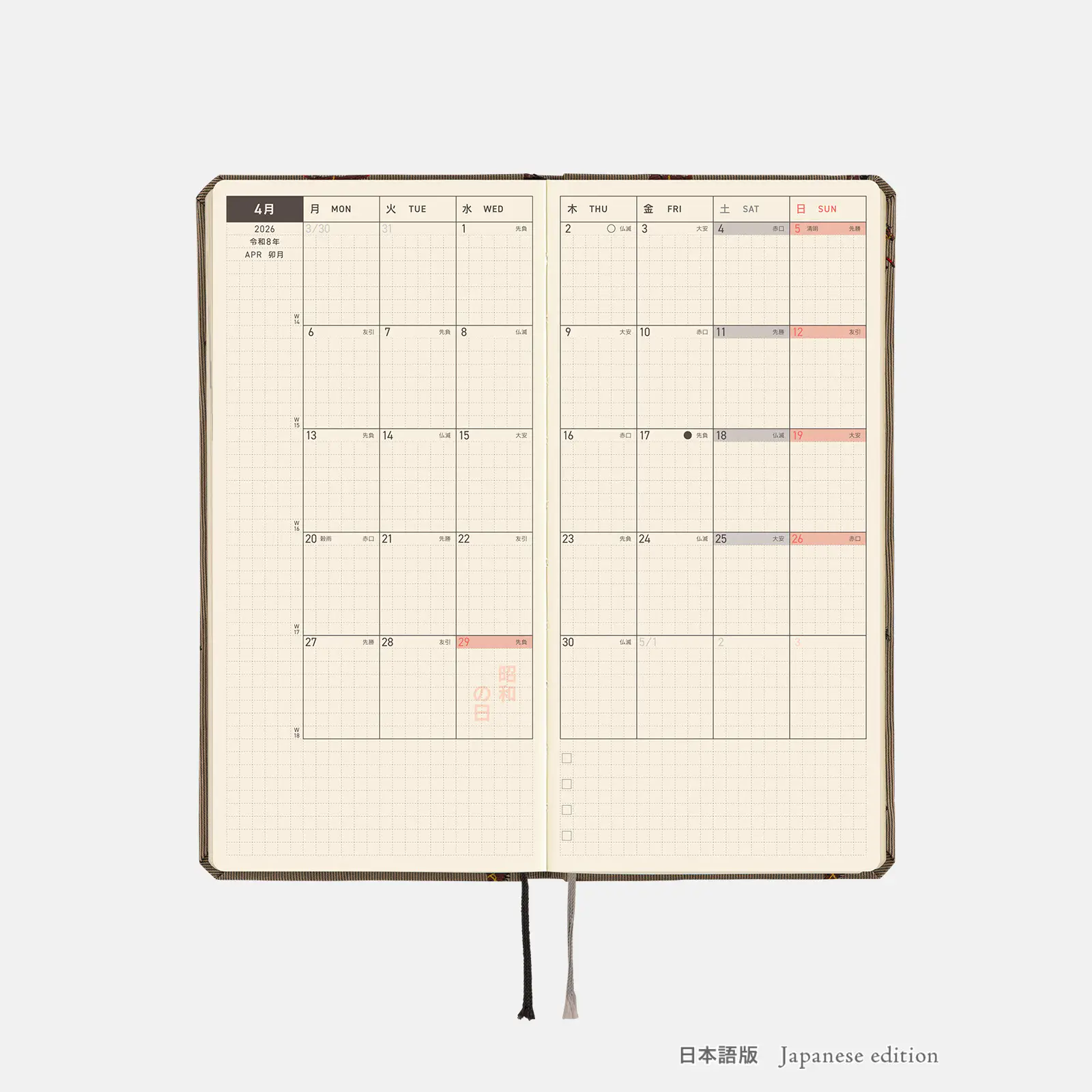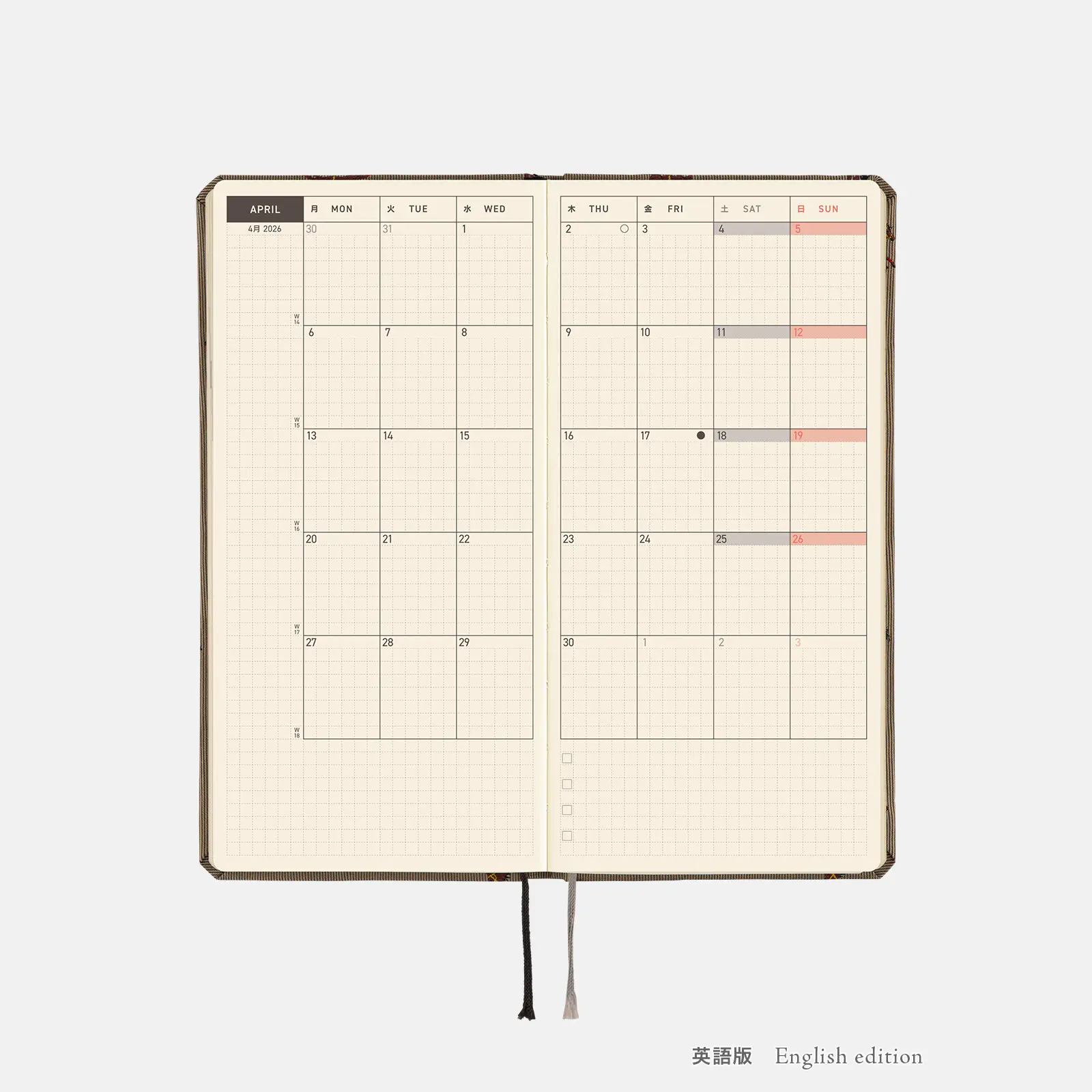 | 紙質・製本 | 薄くて軽く、なめらかな書き心地のトモエリバー(手帳専用紙)/糸かがり製本 |
