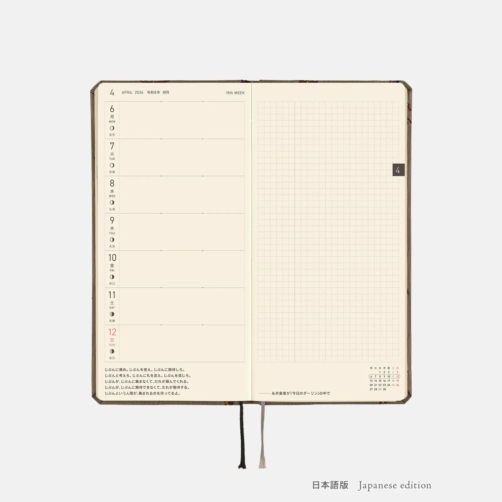 | 記載される内容 | 週番号/六曜(大安、仏滅など)/二十四節気(立春、春分、夏至など)/祝日、記念日など(聖バレンタインデー、ひな祭り、母の日、父の日など)/月の満ち欠け(週間ページ全てに記載・月間カレンダーに満月と新月のみ記載) |