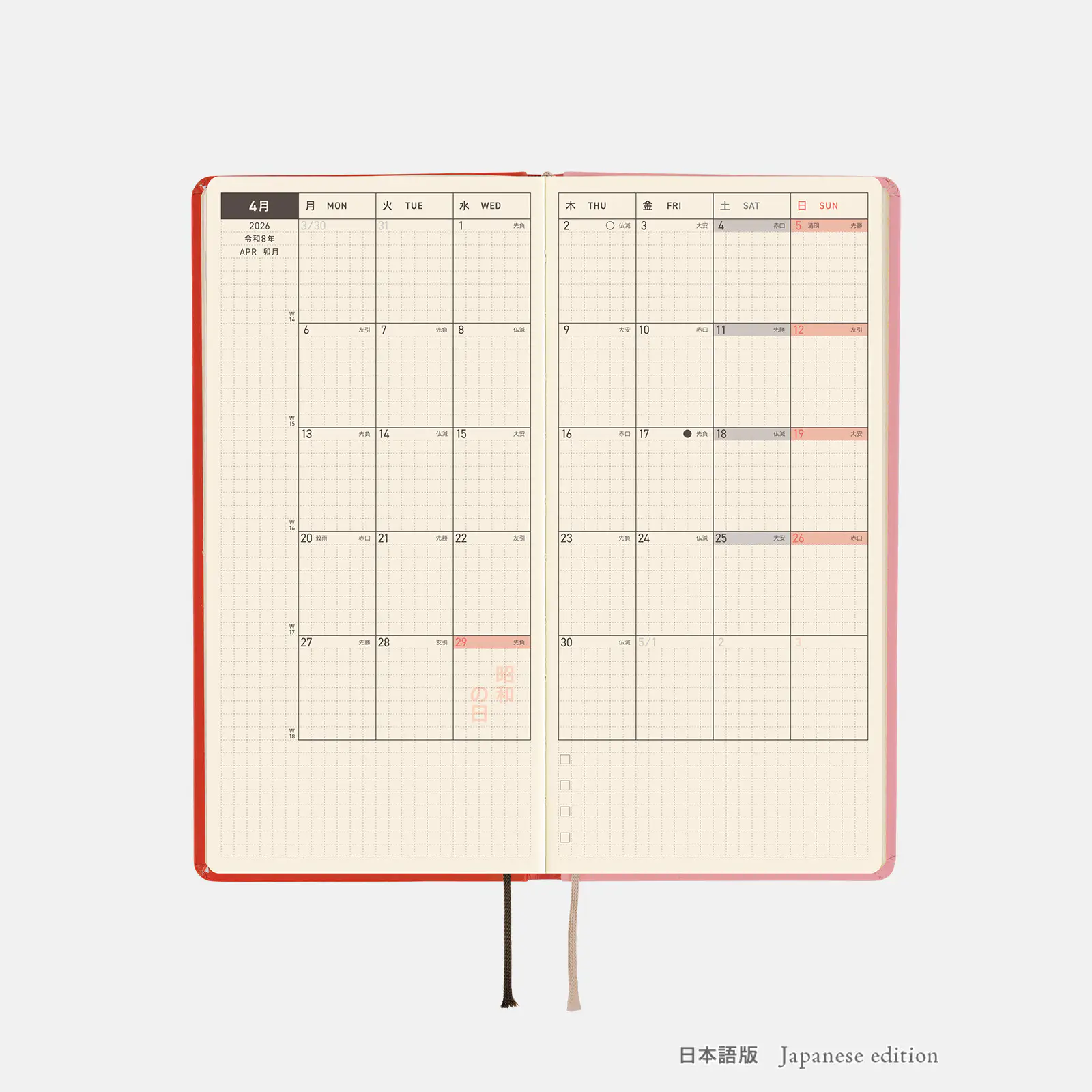 | 記載される内容 | 週番号/六曜(大安、仏滅など)/二十四節気(立春、春分、夏至など)/祝日、記念日など(聖バレンタインデー、ひな祭り、母の日、父の日など)/月の満ち欠け(週間ページ全てに記載・月間カレンダーに満月と新月のみ記載) |