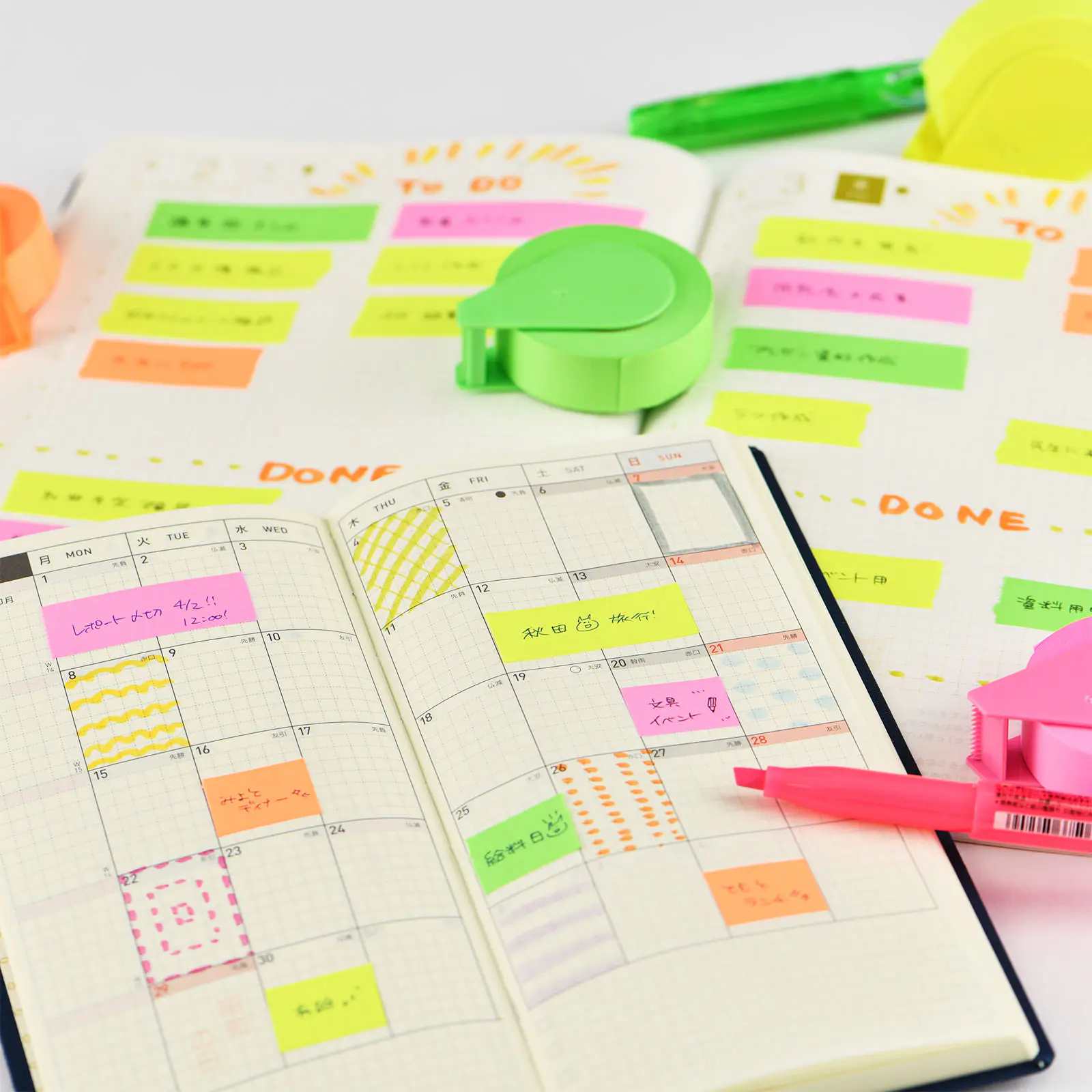 | 主な素材 | テープ:〔蛍光紙〕上質紙 粘着剤:アクリル系 カッター:ポリスチレン |