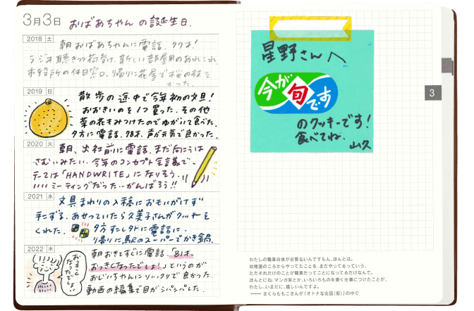 誕生日を迎えたおばあちゃんの年齢や電話で話したことなどが、同じページに積み重なっていきます。その日の仕事や買い物のことなども短くメモしておくことで、あとから思い出したときのうれしさがさらに増します。