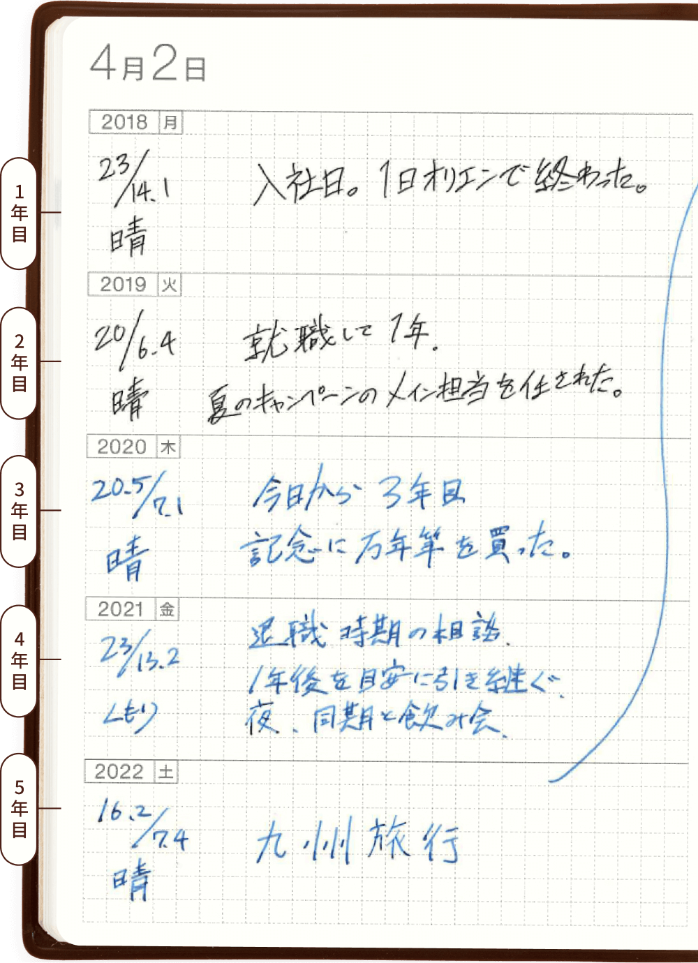 社会に出てからの5年間でどんな成長や変化があるかを残せます。「気温、天気、1行程度のメモ」とシンプルにかくだけでも、5年分が積み重なると貴重な記録に。「メモは1行でOK」と決めておくことで無理なく続けられます。