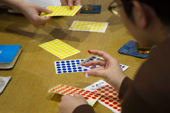 会議の中盤。いつの間にか人には黄色、手帳には青の色が塗られていました。