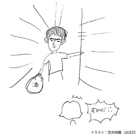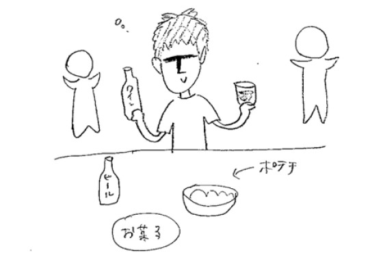 お菓子とお酒を片手に横山さんが現れました。