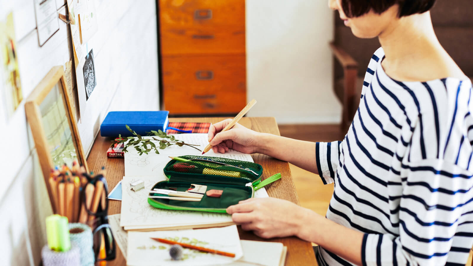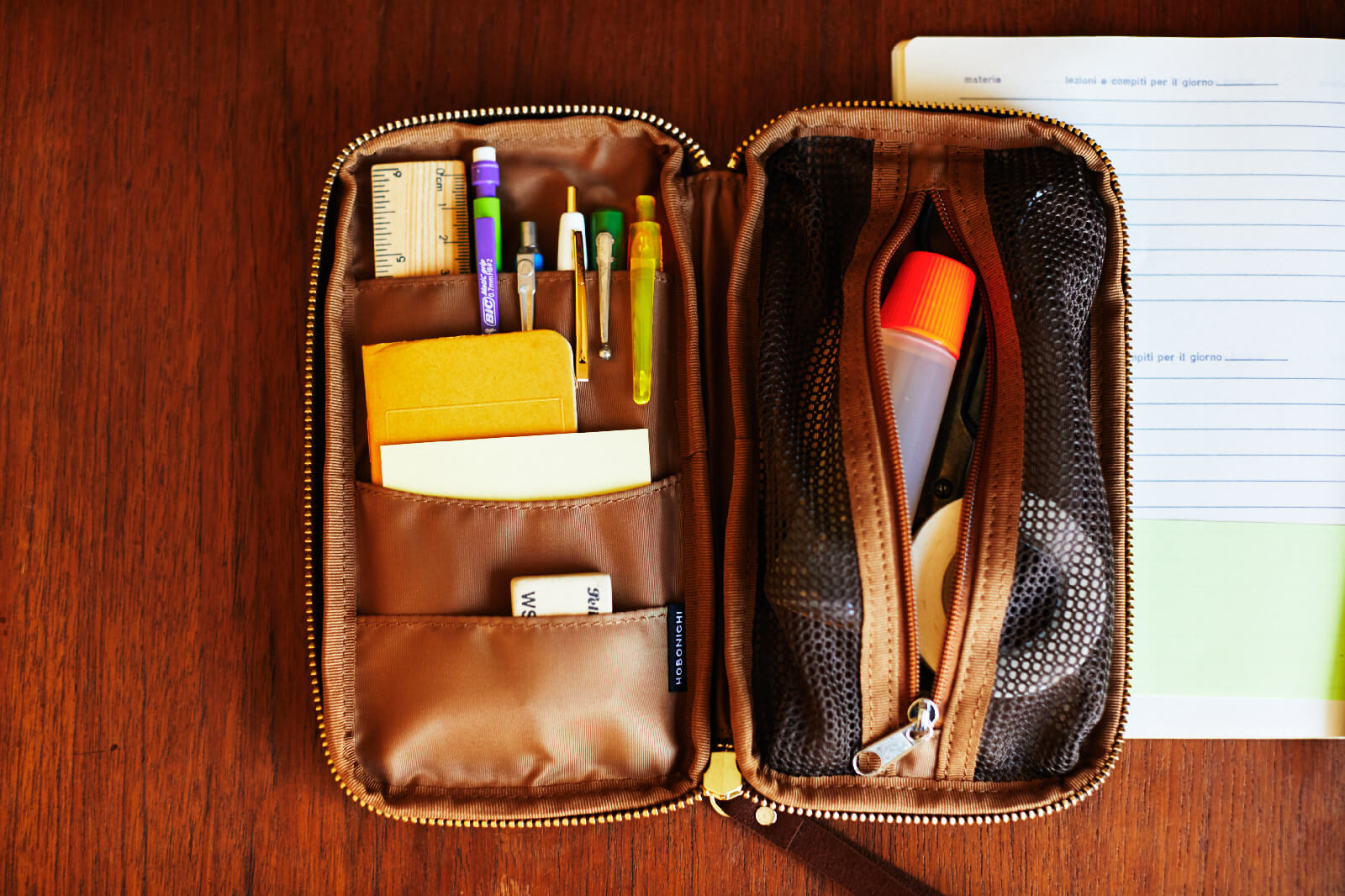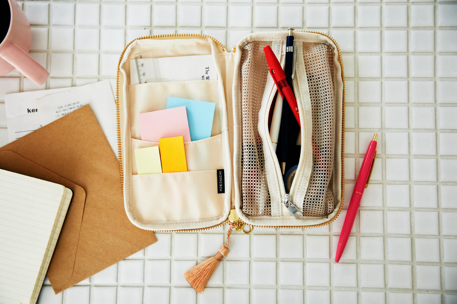 ペン類はもちろん、すこしかさばるハサミや修正液まで、使う頻度の高い文房具をコンパクトに収納。