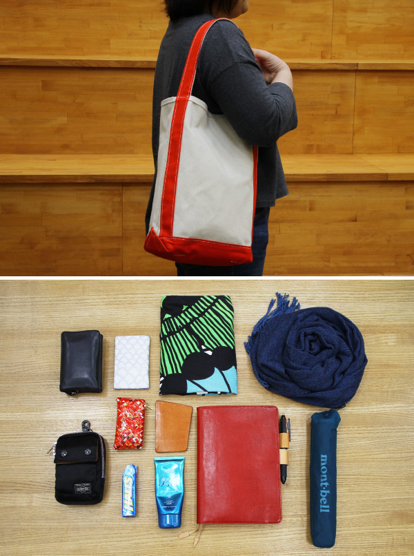 いのうえのトートの中には、カズンサイズの手帳や厚手のくびまきなど、かさばるものがたくさん。「こんなに入れても、まだまだ余裕がありますよ!」
