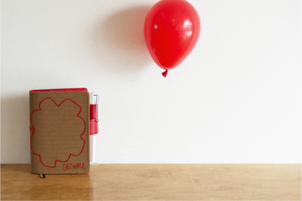 「CACUMA」のロゴ入りの赤い巾着袋に包んだカバーを