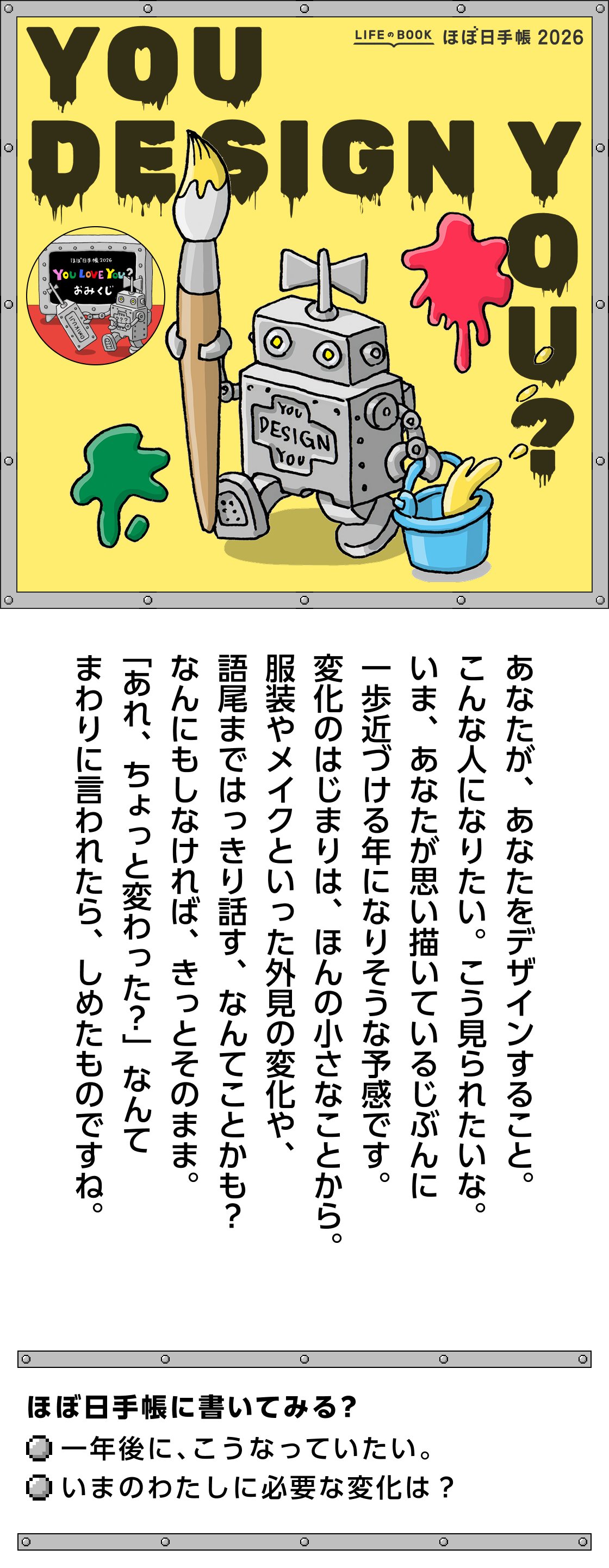 あなたが、あなたをデザインすること。 こんな人になりたい。こう見られたいな。 いま、あなたが思い描いているじぶんに 一歩近づける年になりそうな予感です。 変化のはじまりは、ほんの小さなことから。 服装やメイクといった外見の変化や、 語尾まではっきり話す、なんてことかも? なんにもしなければ、きっとそのまま。 「あれ、ちょっと変わった?」なんて まわりに言われたら、しめたものですね。
