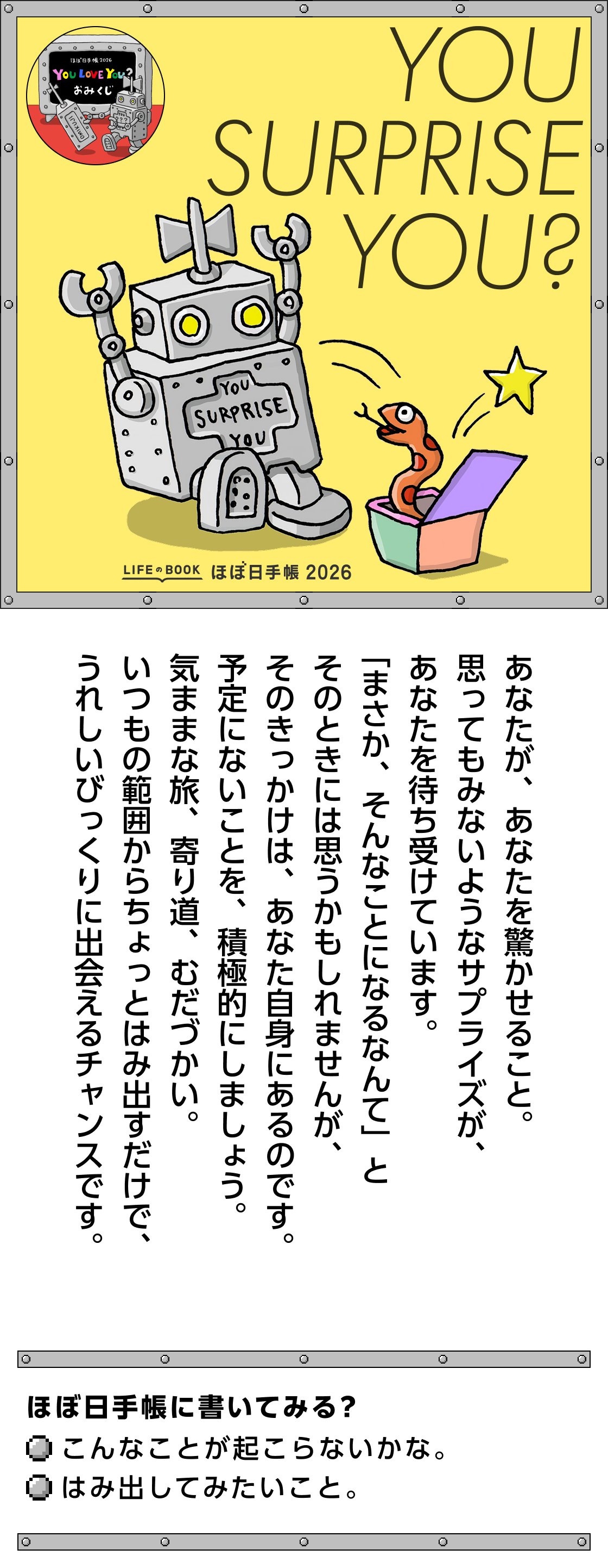 あなたが、あなたを驚かせること。 思ってもみないようなサプライズが、 あなたを待ち受けています。 「まさか、そんなことになるなんて」と そのときには思うかもしれませんが、 そのきっかけは、あなた自身にあるのです。 予定にないことを、積極的にしましょう。 気ままな旅、寄り道、むだづかい。 いつもの範囲からちょっとはみ出すだけで、 うれしいびっくりに出会えるチャンスです。