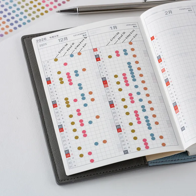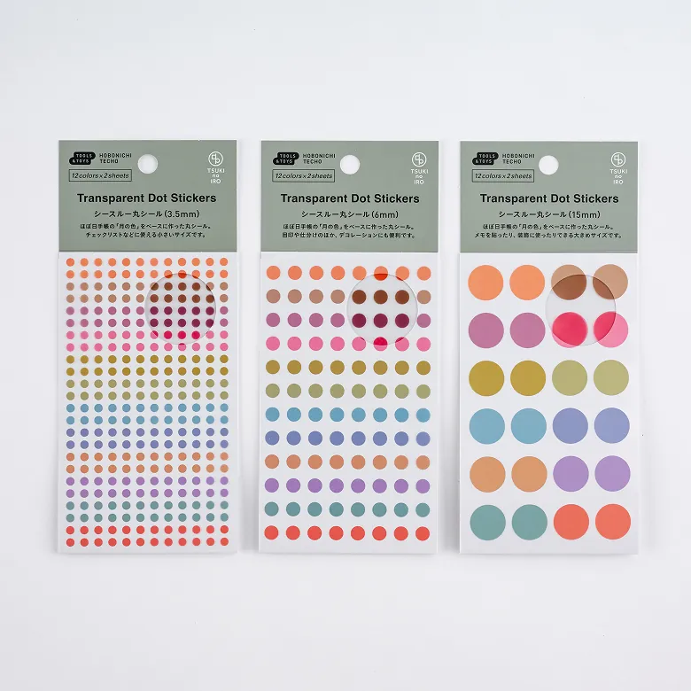 ハリのあるフィルム素材でつくった透明な丸いシール。ほぼ日手帳の方眼に気持ちよくおさまる大きさの3サイズがあります。